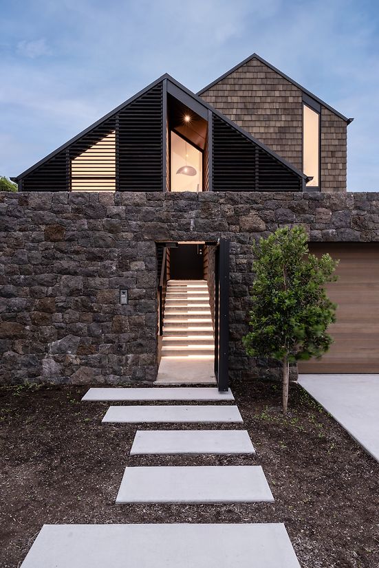 To address the visual impact of the raised floor level, the design introduces a bold stone wall across the street-facing elevation. This element grounds the house within the site, reducing the perceived height and providing privacy and shelter. The garage is seamlessly integrated into this wall, pushing forward of the living spaces to help step the building down toward the street and soften its scale.