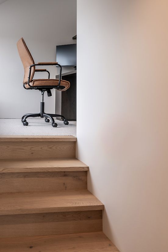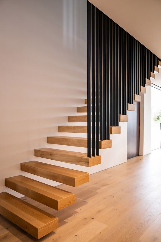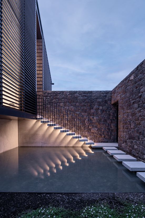 The entrance to the home is framed by a series of cantilevered concrete steps that float over a reflecting pond, creating a memorable and welcoming threshold. This moment of calm reinforces the coastal setting and introduces water as a recurring material element in the design.