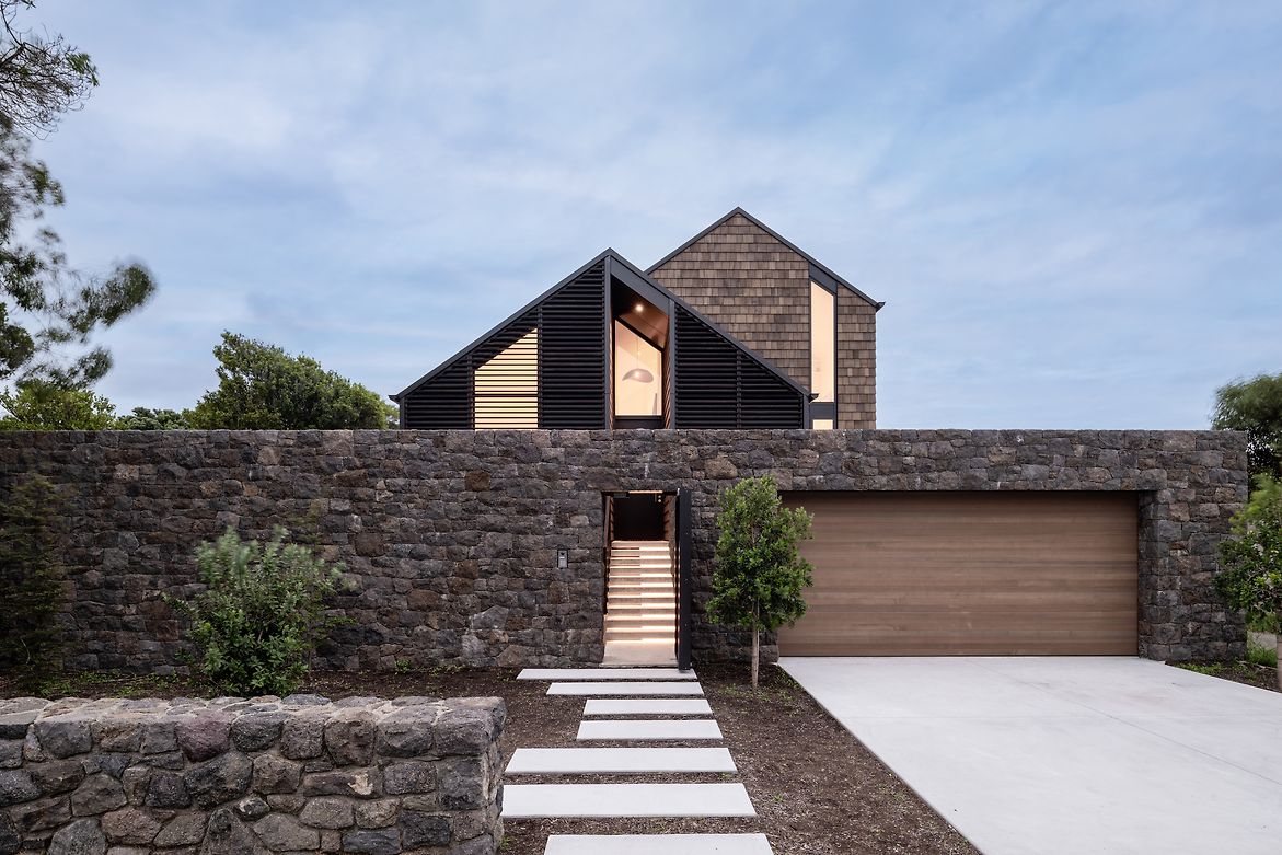 Cedar shingles are used as the primary cladding material across the upper volumes of the home. Chosen for their durability and weathering qualities, the shingles offer a warm, textural contrast to the solidity of the stone wall. A timber shutter screen wraps the front gable, providing privacy for the bedroom behind while adding rhythm and softness to the public-facing façade.