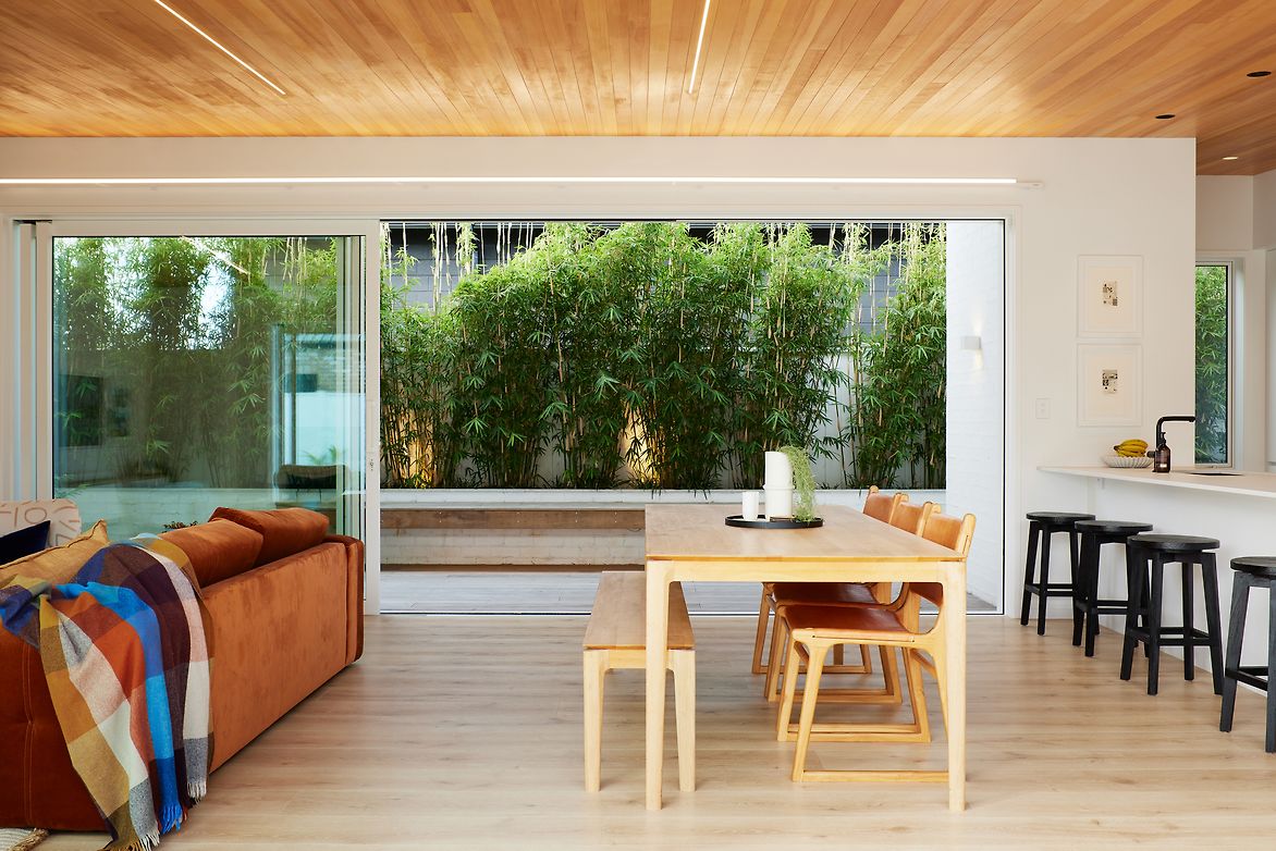 The interior spaces offer restraint with material selection, with warm whites complemented with timber flooring and sarking, bringing a sense of calm and softness. The living area, oriented along the north-south axis, is optimally positioned for cross-ventilation and passive solar heating. Oversized eaves to the west elevation mitigate excessive heat gains, ensuring comfortable temperatures all year round. Low maintenance and durable materials such as painted clay bricks, painted thermally-modified timber weatherboards and exposed Siberian Larch compose the external envelope, prioritising low-embodied carbon. High-performance glass wool insulation and double-glazing low-e joinery units paired with optimum sun orientation ensure thermal comfort for the end users. The living areas are further expanded with generous decks to the east and west offering various opportunities to inhabit space - be it with a built-in seat shaded by densely populated bamboo or under the louvred outdoor living.