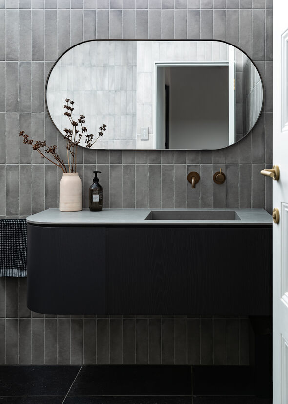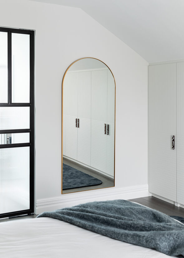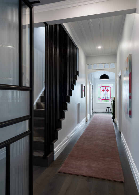 The somewhat simple concept of opening up the end hallway wall has fundamentally changed the flow and configuration of the interior spaces - allowing visual and material connection throughout while also bringing you straight into the heart of the home. The introduction of non-traditional materials within a character villa environment, such as black powder-coated steel for balustrading and joinery, creatively blends old and new. Antiqued brass connects materials throughout as a ledge above the black Dekton fireplace and the timber veneer cabinetry above and as the division between the ‘working space’ and the ‘entertaining space’ of the 4m long kitchen island.