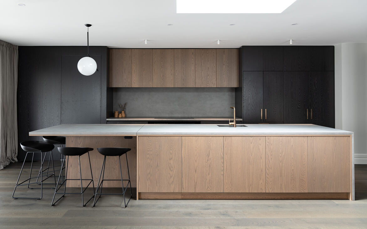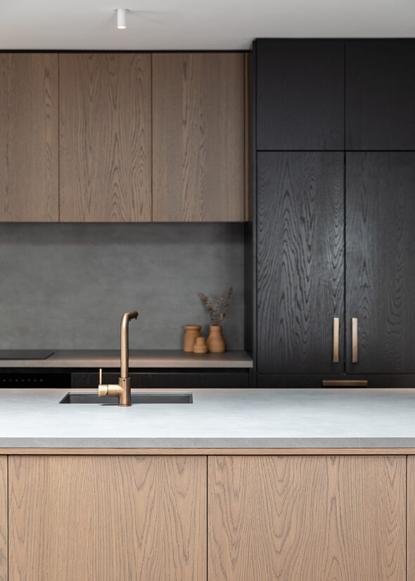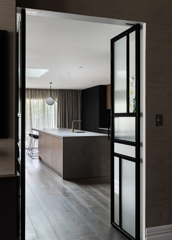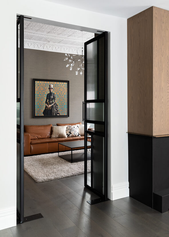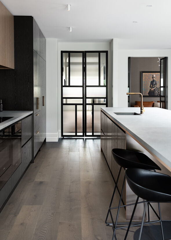 Interior spaces are connected through feature black powder-coated steel and glass doors. The design of these doors was to blend randomness and symmetry through the use of different types of glass and different panel sizes. Their functional intent was to create light and open spaces. As a material treatment the black steel used in the doors and stair balustrades provides a modern aesthetic, balanced by the classic antiqued brass accents which are threaded through the interiors. Brass tap-ware and handles soften the dark material palette while antique brass plating provides key intersection points between materials in all cabinetry. Stained planked & brushed oak veneer cabinetry throughout creates cohesion between spaces as well as evoking warmth & texture.