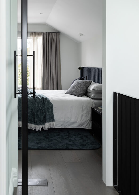 The interior palette response was simplicity of materials & finishes - soft grey walls, stained timber veneer cabinetry, antiqued brass accents while black steel doors & balustrades formed key design elements. Spaces were personalised with wallpaper, rugs & wardrobe handles.