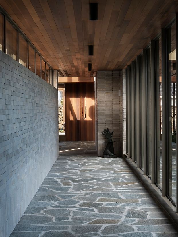 Inspiration came from the client's memories of her grandparents mid-century home which was built around a courtyard and expressed a cosy ambience through a soft palette of textured materials. The new home responds to this by drawing on the principles of modernist architecture to develop a fluent design language that extends from the exterior articulation of the home to the resolution of interiors.