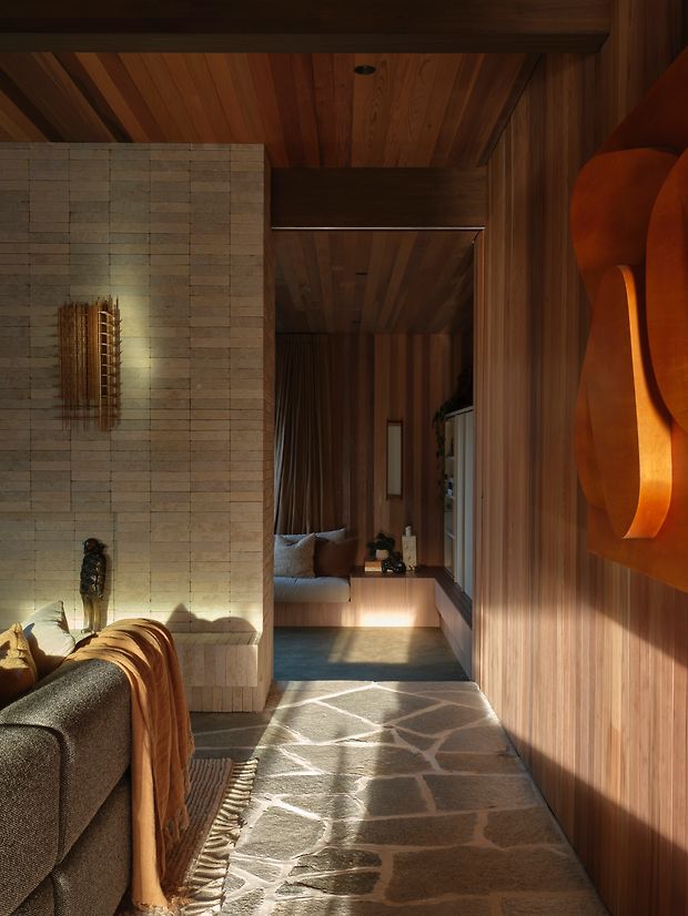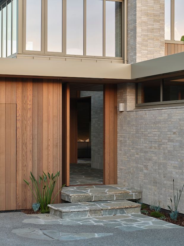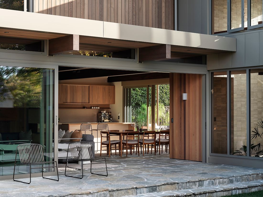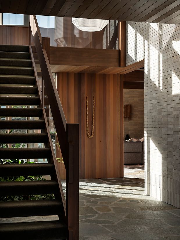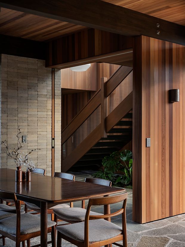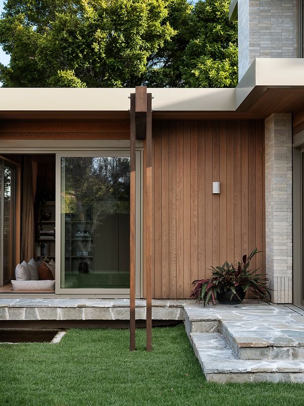 Inspiration came from the client's memories of her grandparents mid-century home which was built around a courtyard and expressed a cosy ambience through a soft palette of textured materials. The new home responds to this by drawing on the principles of modernist architecture to develop a fluent design language that extends from the exterior articulation of the home to the resolution of the interiors.