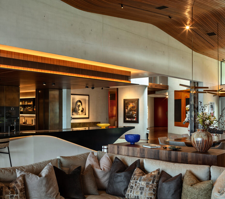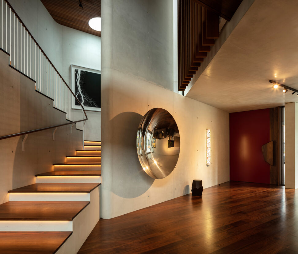 The sculptural flowing forms of cream concrete, timber floors and ceilings, a bridge, a long slow stair, and other elements celebrate free flowing spaces and connections to the outside, reflecting the natural light that animates the interior spaces.