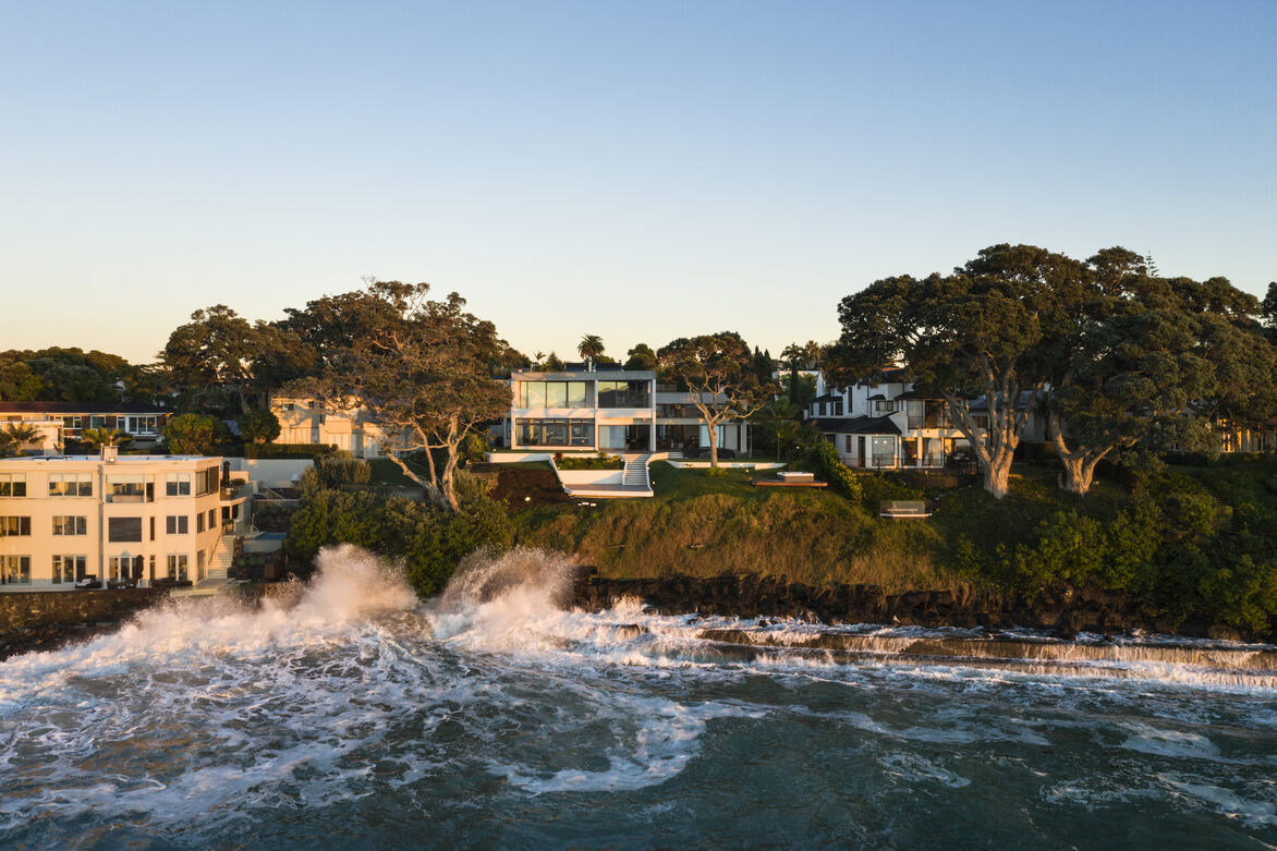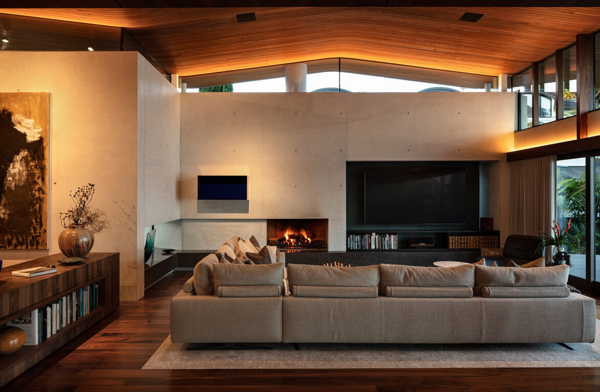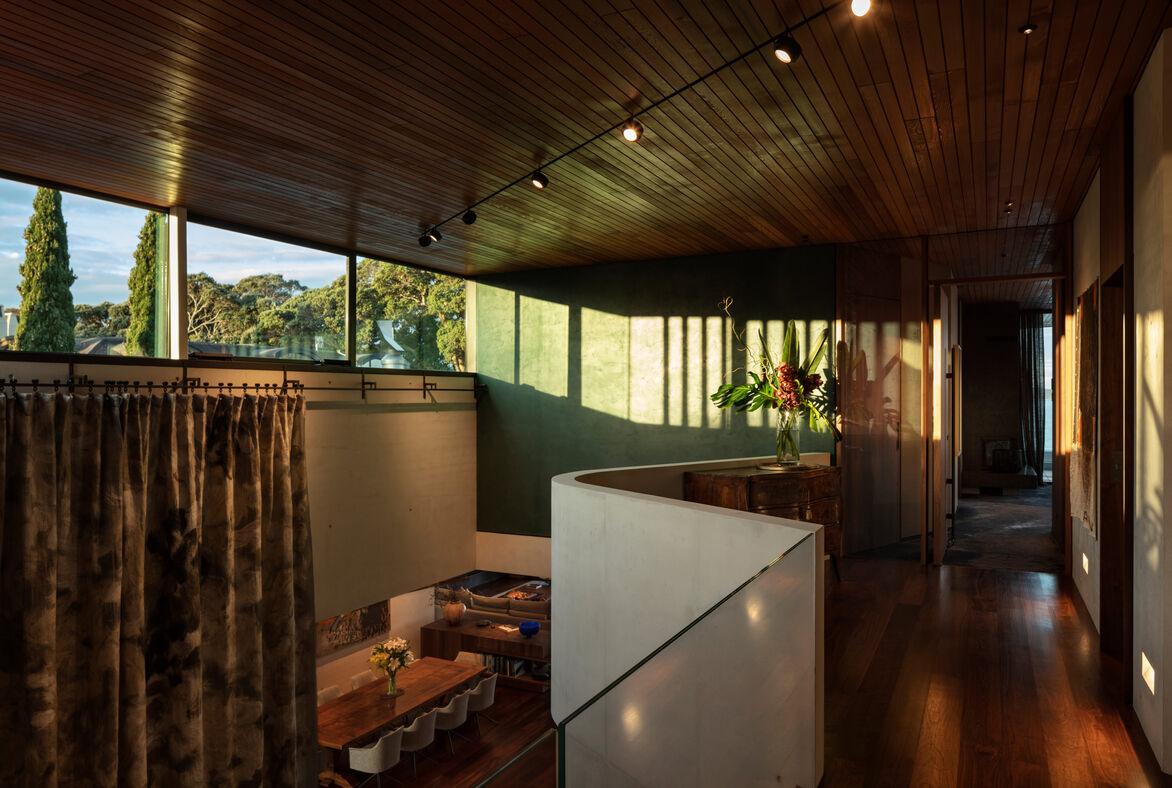 The layered tones and textures of these materials are reminiscent of the volcanic basalt lava rock forms of the cliff and foreshore that fringe the site, the Pohutukawa trees, and the whitewater created by the ocean crashing against the shoreline. Gathered around the building are a series of terraces that extend into the interior by way of fireplace hearths and ledges, exquisitely formed and laid by terrazzo specialists with a selected volcanic aggregate-that further speaks to the basalt rock formations.