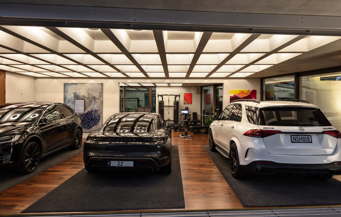 The large garage and gym spaces demanded a hardworking structural floor and ceiling above, which we designed closely with the structural engineers and specialist concrete contractor as an insitu waffle slab. This allowed for a special lighting effect, with each softly curved waffle individually lit-allowing the warm walnut timber floored space below to transformed into a party space when required.