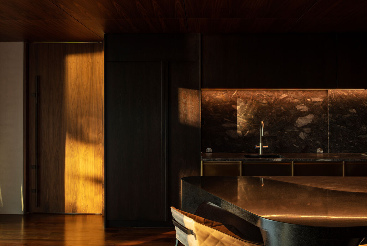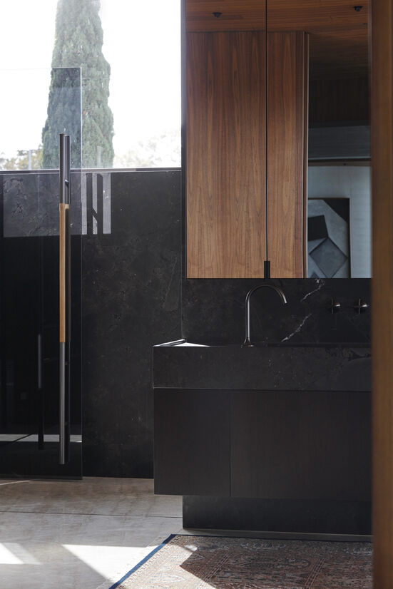The strong superstructure of the home is constructed in creamy white off form insitu concrete, insulated in instances where exterior wall meets interior and emanates a sense of permanence. The elements of concrete wall are complemented externally by sheets of marble stone rainscreen cladding, cedar weatherboards, GRC fascia panels, and glass. Interior ceilings are lined in cedar sarking, wrapped over gentle rolling curves in some instances. Walnut timber floors to main living areas and interior door joinery adds warmth to the spaces, while soft carpet and textured wallpapers and fabrics soften the more intimate private bedroom spaces. The bathrooms and steamroom are lined and finished with natural stones and tiles, with aged brass strips defining the transitions in material. Detail is further considered right down to the lightest touch, with hand stitched leather wrapped door handles that give warmth to the handmade aged brass handmade hardware.