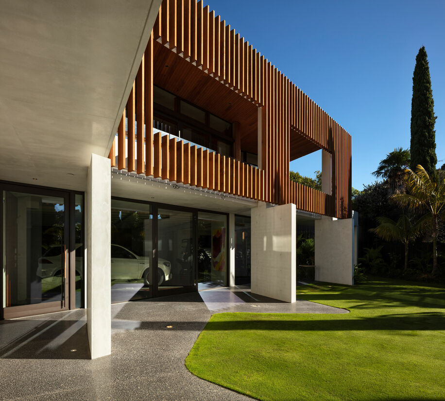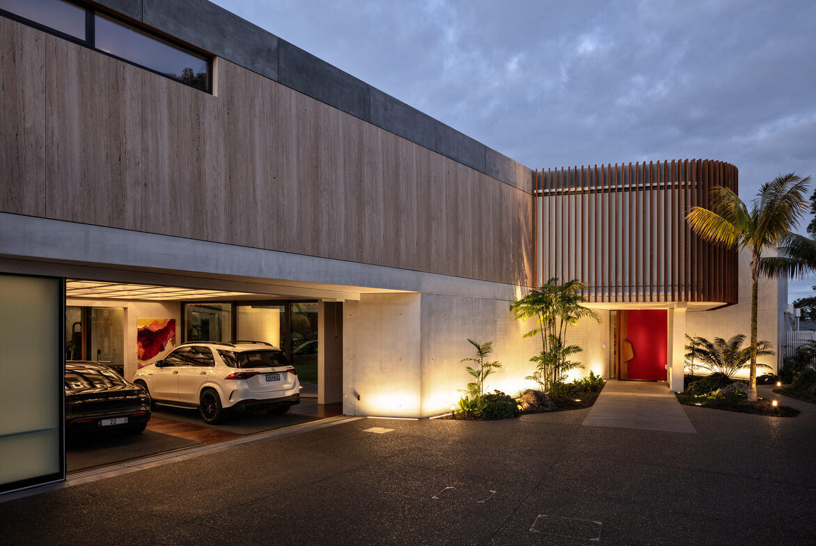 A partially enclosed central garden is a sun trap protected from prevailing winds. Sculptural forms of cream concrete, timber floors and ceilings, a bridge, a long slow stair, and other elements celebrate free flowing spaces and connections to the outside. Natural light reflects and animates the spaces. The site has relatively narrow linear proportions, stretching from the right-of-way driveway out towards the sea and Rangitoto beyond. The eastern end drops dramatically down to the wave-worn volcanic rockforms. The house is at the end of a private driveway that services 10 houses, so is secluded from the street. The linearity of the site is reinforced by the architecture, with planes of concrete wall running the full length of the house leading towards the sea, contrasted with playful sculptural forms that house the slow stair, deep windows, and fireplace. The building was designed so as to not overlook adjacent houses or overshadow them. The strong superstructure of the home is constructed in creamy white off form insitu concrete, insulated in instances where exterior wall meets interior and emanates a sense of permanence. The elements of concrete wall are complemented by sheets of marble stone rainscreen cladding, cedar weatherboards, GRC fascia panels, and glass. Interior ceilings are lined in cedar sarking, wrapped over gentle rolling curves in some instances. Walnut timber floors to main living areas and interior door joinery adds warmth to the spaces, with carpet and tiles to bedrooms and bathrooms. Gathered around the building are a series of terraces, exquisitely laid by terrazzo specialists with a selected volcanic aggregate that speaks to the basalt lava rock forms of the cliff and foreshore that fringe the site.
