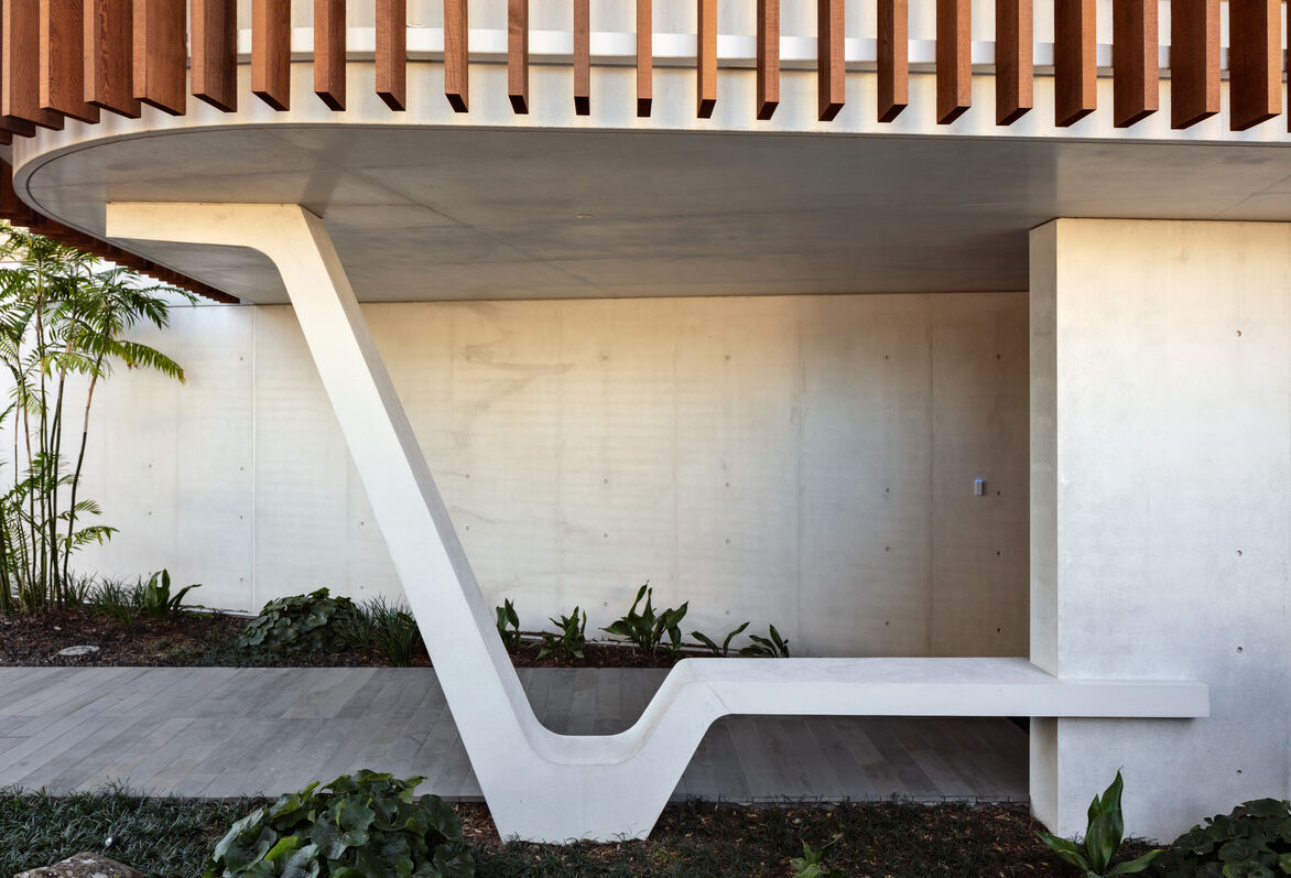 The strong superstructure of the home is constructed in creamy white off form insitu concrete, insulated in instances where exterior wall meets interior and emanates a sense of permanence. The elements of concrete wall are complemented by sheets of marble stone rainscreen cladding, cedar weatherboards, GRC fascia panels, and glass. Interior ceilings are lined in cedar sarking, wrapped over gentle rolling curves in some instances. Walnut timber floors to main living areas and interior door joinery adds warmth to the spaces, with carpet and tiles to bedrooms and bathrooms. Gathered around the building are a series of terraces, exquisitely laid by terrazzo specialists with a selected volcanic aggregate that speaks to the basalt lava rock forms of the cliff and foreshore that fringe the site.