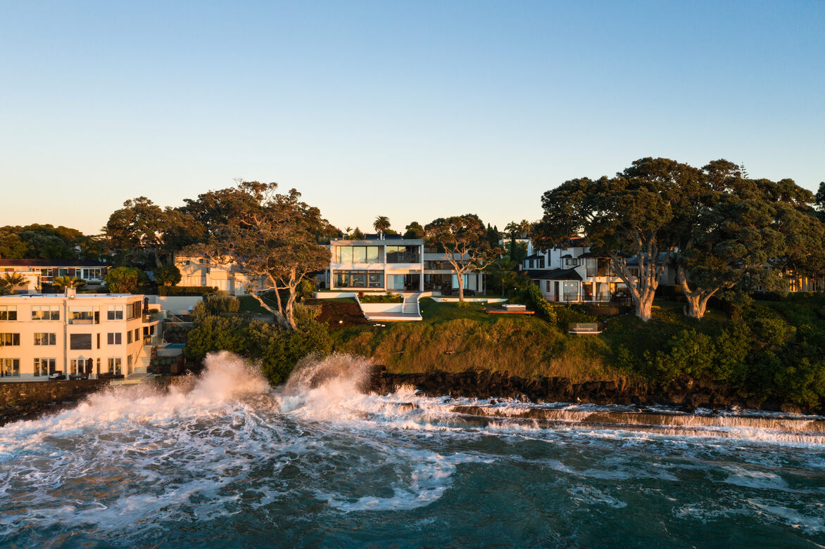 The site has relatively narrow linear proportions, stretching from the right-of-way driveway out towards the sea and Rangitoto beyond. The eastern end drops dramatically down to the wave-worn volcanic rockforms.