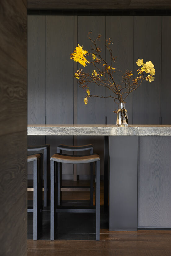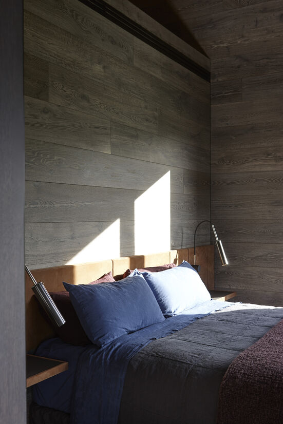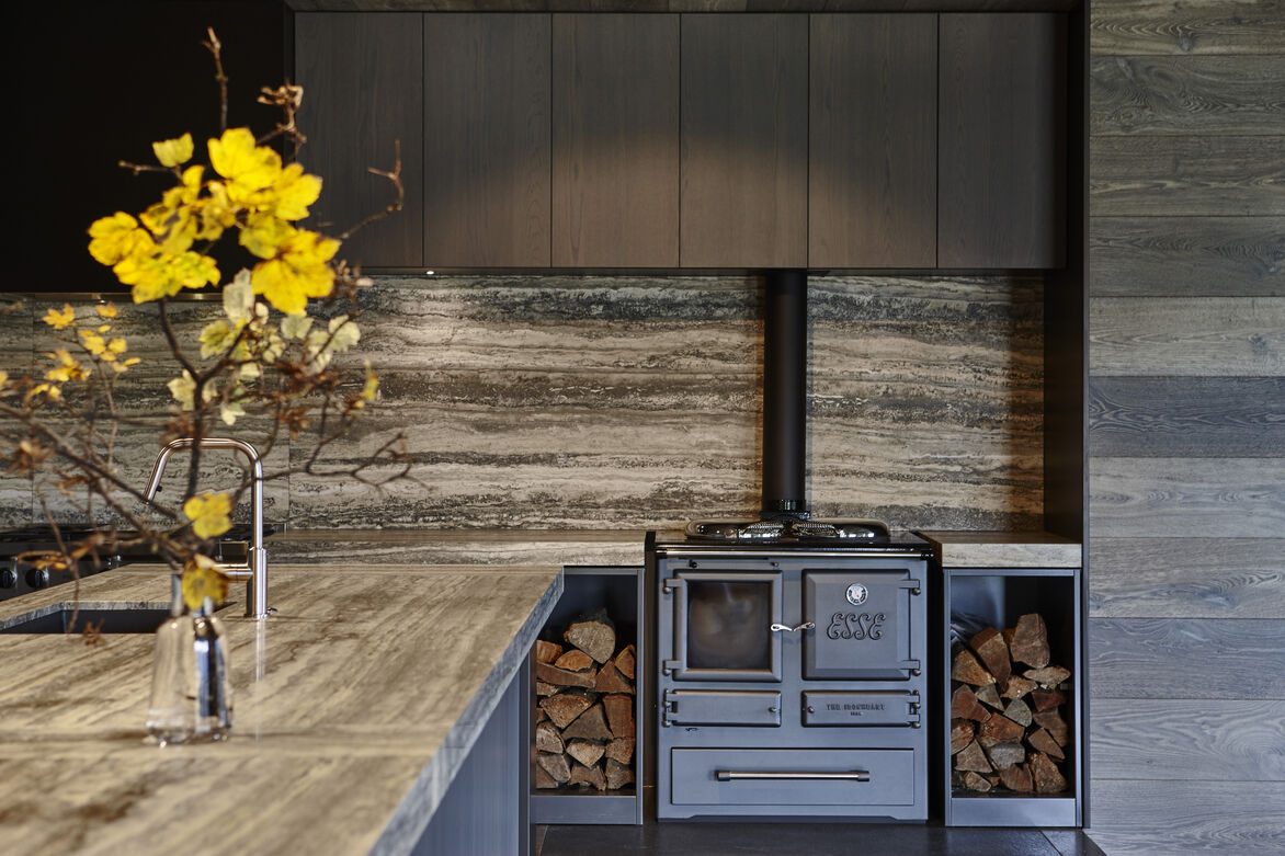 From the entrance, the interior progression is one of descent into an interior that is like a finely crafted piece of joinery, with floors, walls and ceilings in solid oak balanced with moments of exposed schist for contrast. The prevalence of natural materials continues into the bathrooms with solid slabs of silver travertine, and into the kitchen where a thick slab of ocean black travertine sits either side of the wood-burning stove that anchors the space..