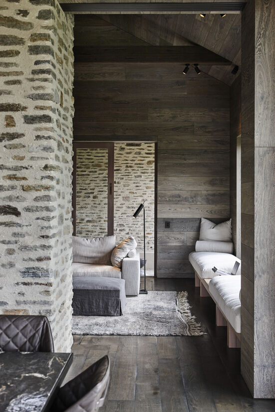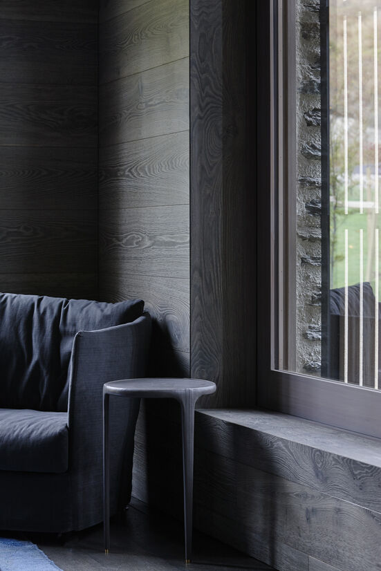 Dark, moody and textual stone combined with dark stained timber and steel elements, contrasting with soft interior furniture and furnishings. Love, love, love!. One imagines a snowy winter with the fire roaring and a glass of whiskey in hand. Take me there!