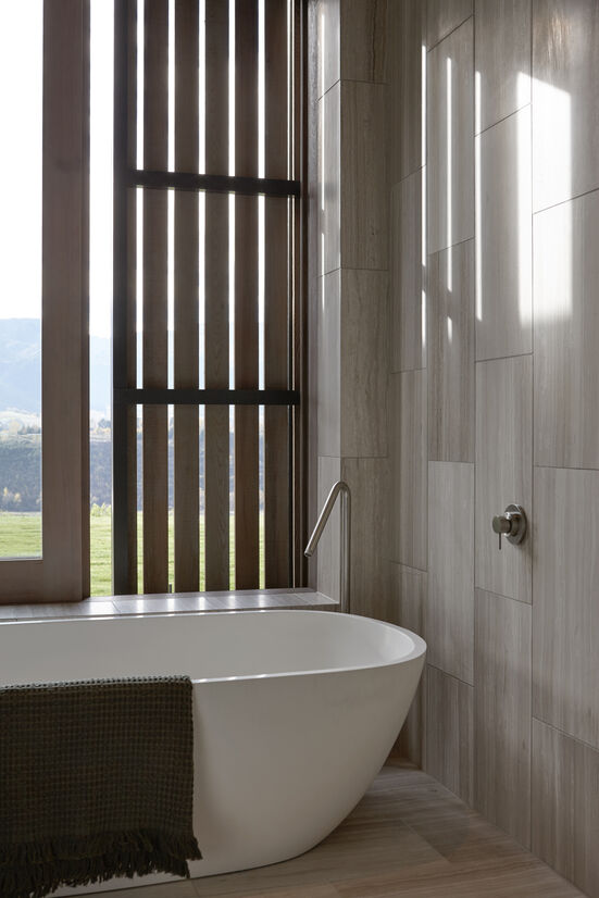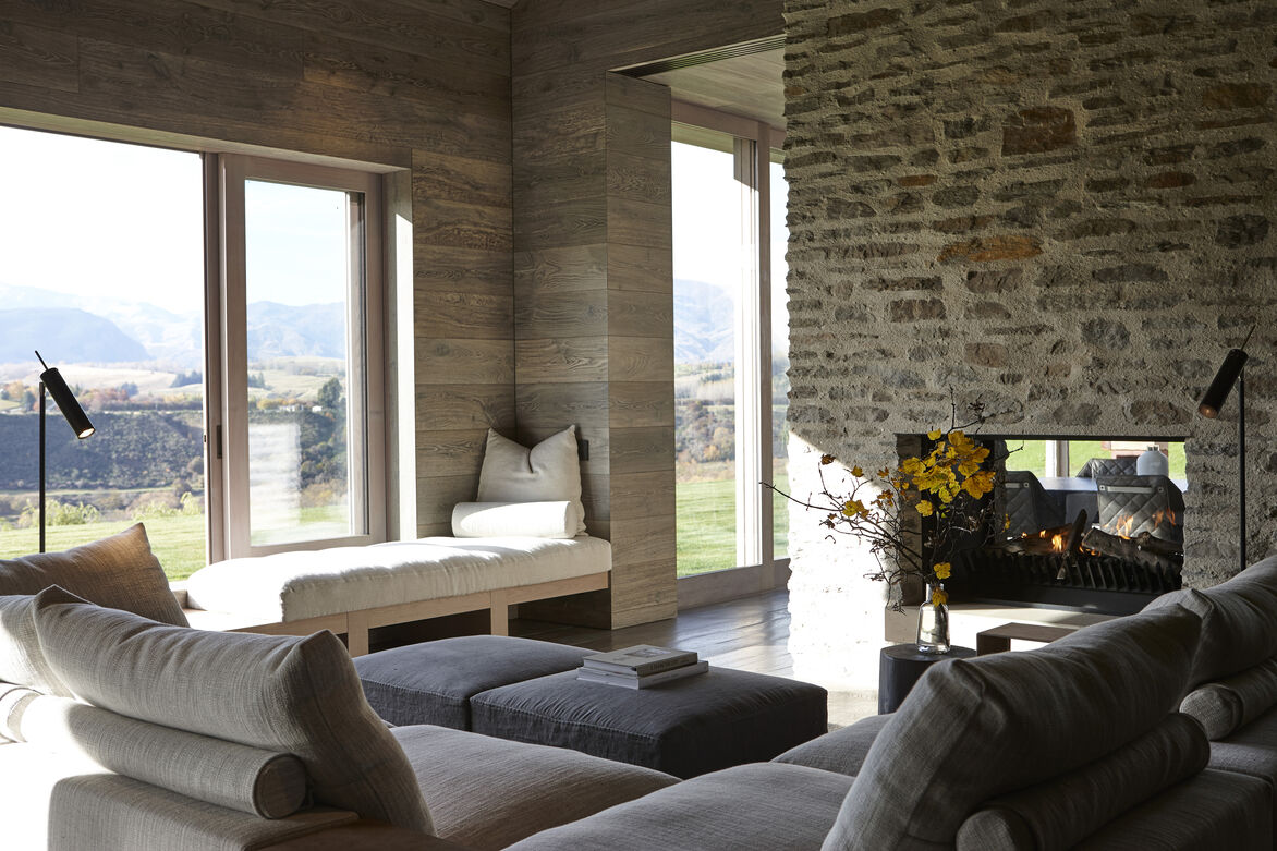 The exterior cladding of the home is regionally sourced schist that communicates an inviting visual warmth through its texture and materiality. Applied to hyper-insulated, 500mm thick walls, it ensures interior comfort regardless of season, and is complemented by moveable screens of cedar battens that track across the windows for precise control of solar gain. Cedar also defines an outdoor space. The strong horizontal lines of the awning fascia and exquisitely detailed cruciform cedar posts give a contemporary uplift to the double-gabled schist forms.
