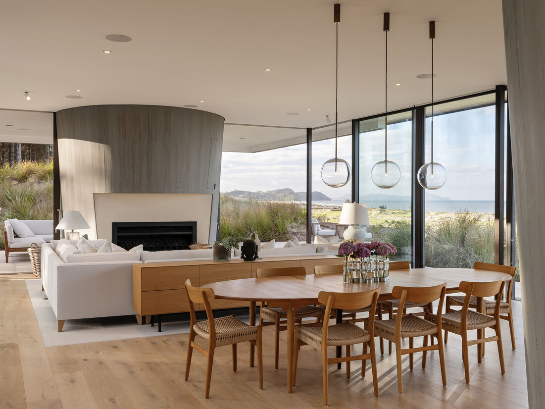 The house is a glazed pavilion siting in the dunescape above a coastal golf links about an hour north of Auckland. The site has wide views from Cape Rodney, Little Barrier Island to Taranga Island and Bream Head in the north. The west has a rising dune covered with remnant pine forest.