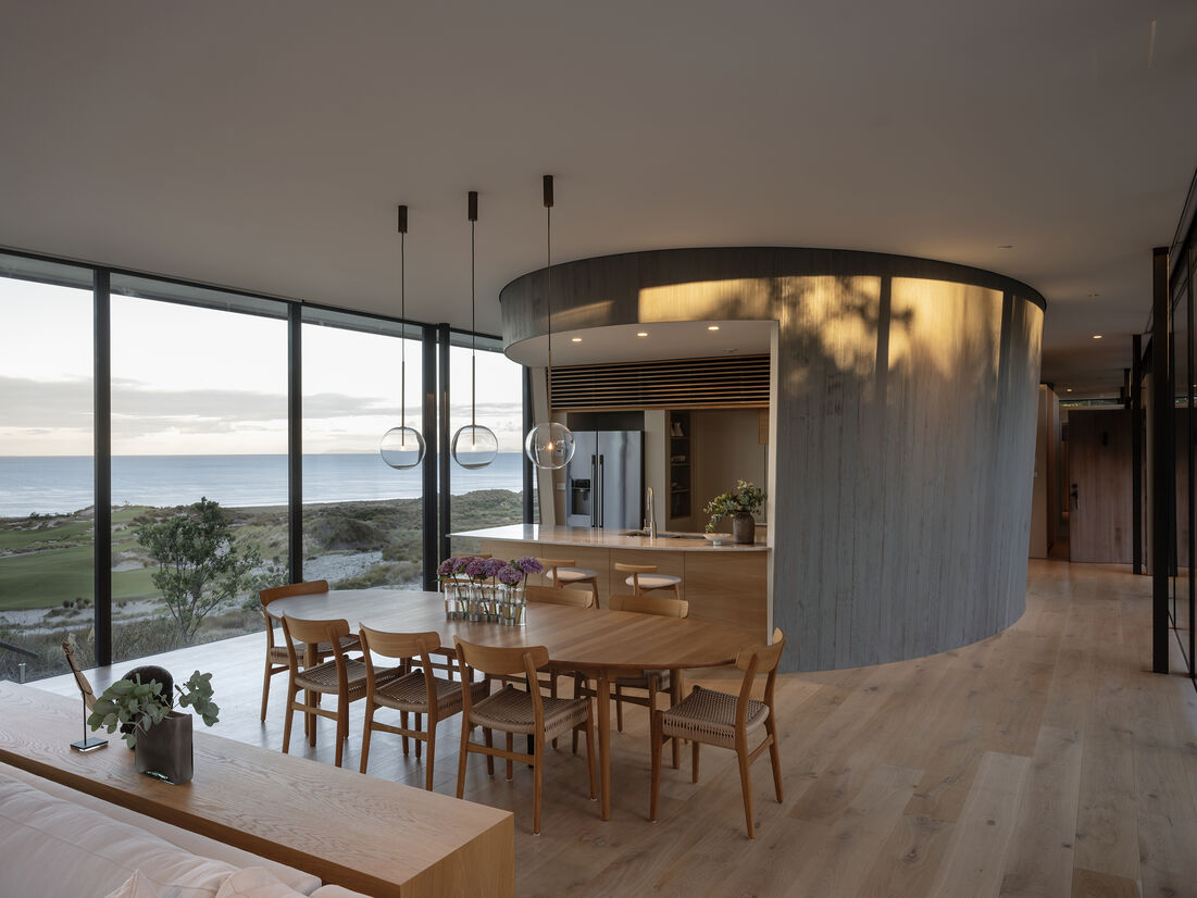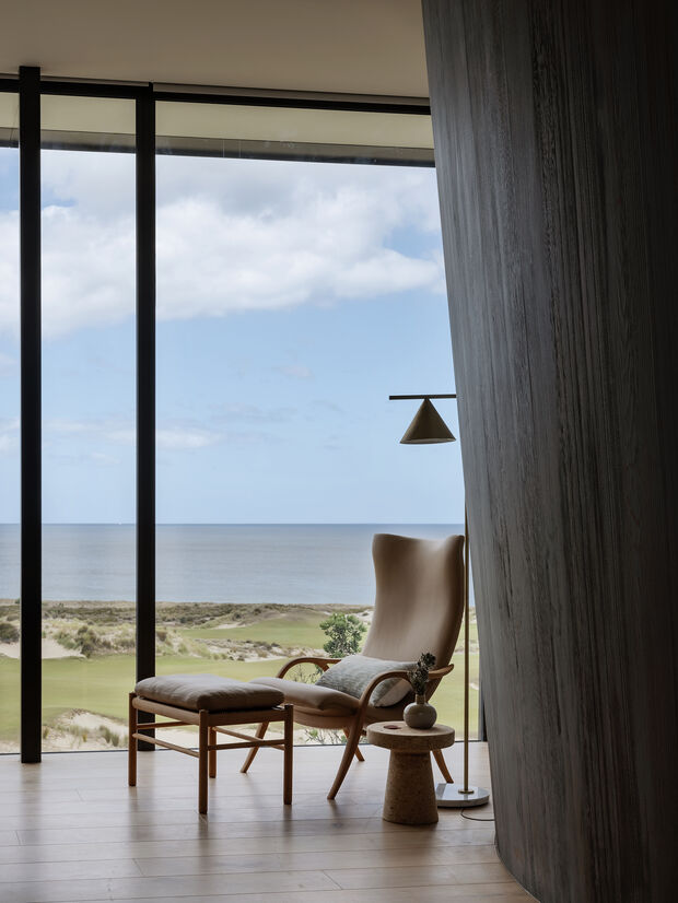 A soft natural pallet was formed encompassing the surrounding landscape as our muse; interior plaster walls finished with the very sand that surrounds the site, light timber floors and locally sourced woollen carpets underfoot. Natural leathered stone, hand glazed tiles, and humble finishing frame the views beyond, as soft flowing curtains provide privacy to the more intimate aspects of the house and a reprieve from the golf course below.