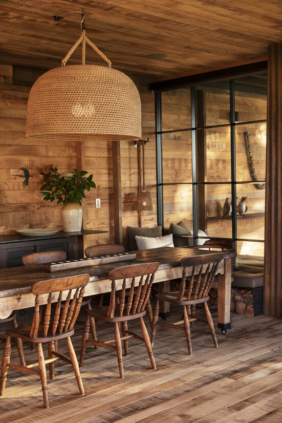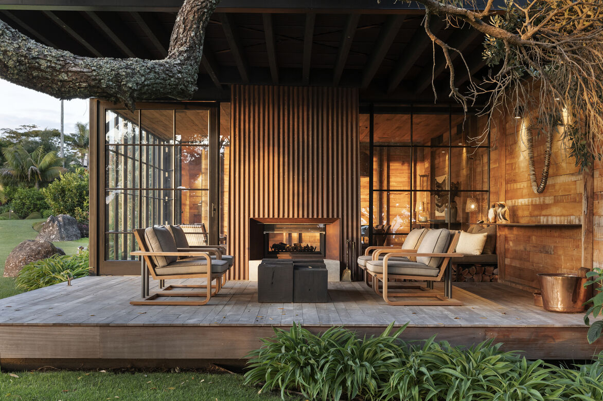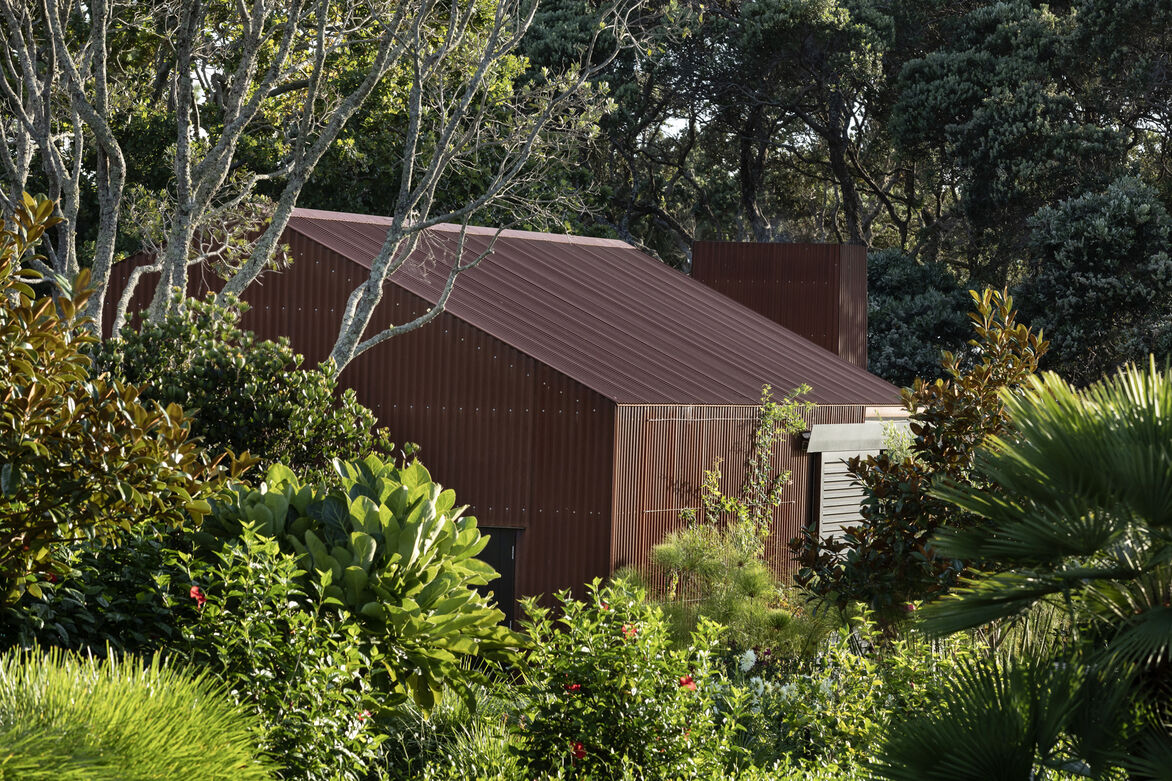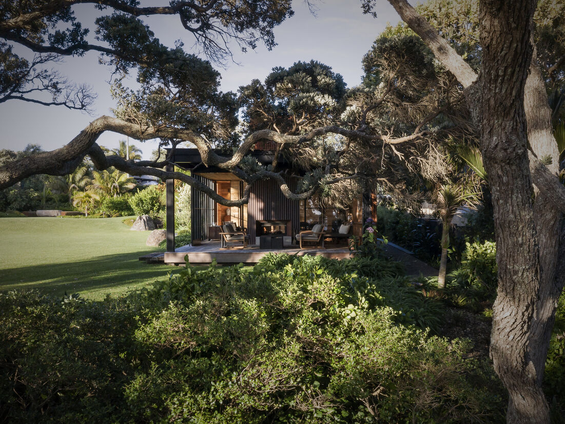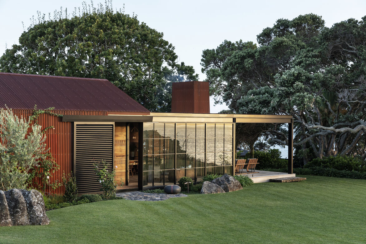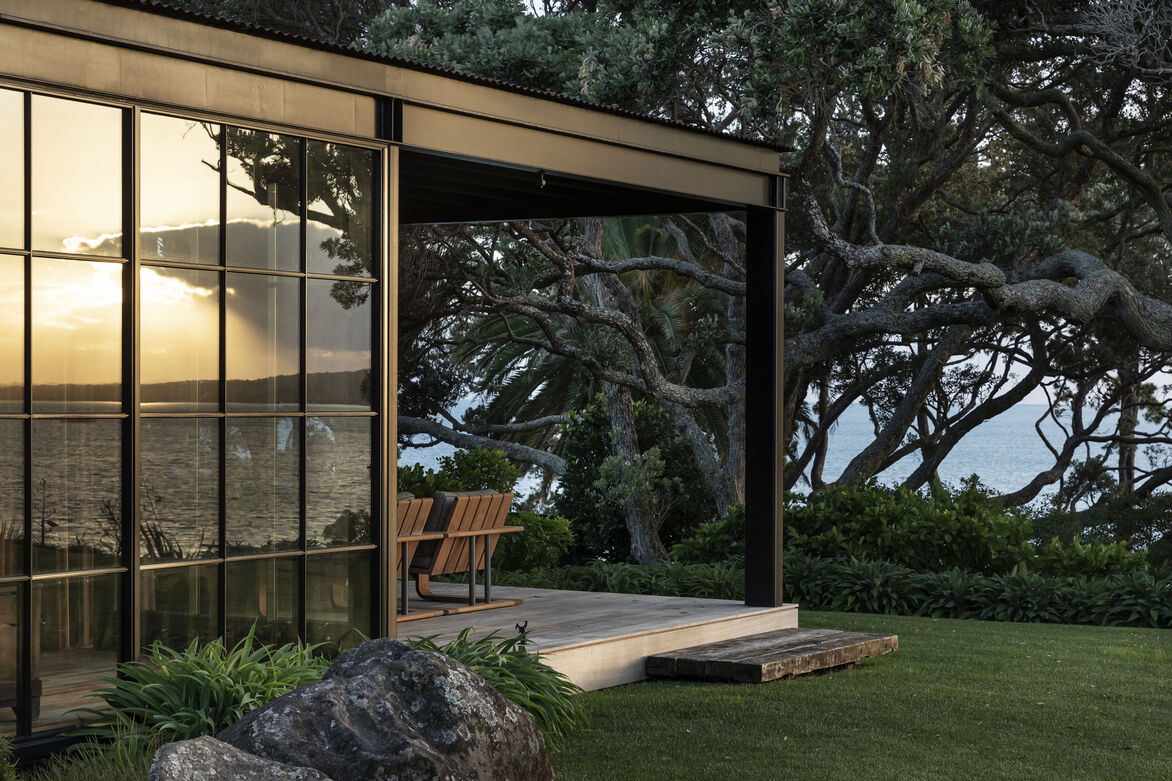 The main room is framed by windows that appear to be steel framed but are actually fine timber fins and give the space the feeling of an enclosed porch. There is a long table inside and comfortable chairs on the outside porch, looking through Pohutukawa to Rangitoto; a fireplace warms both the two spaces.