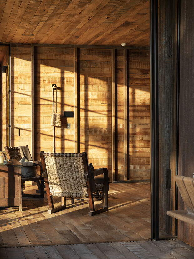 The oxidising Corten steel cladding encloses a single room and a porch lined in reclaimed teak, suggesting a modest simplicity. Yet all is not as it seems, concealed doors give onto a small kitchen and bathroom, a bed folds out into a carefully defined room, as well considered and appointed as the big house across the lawn.