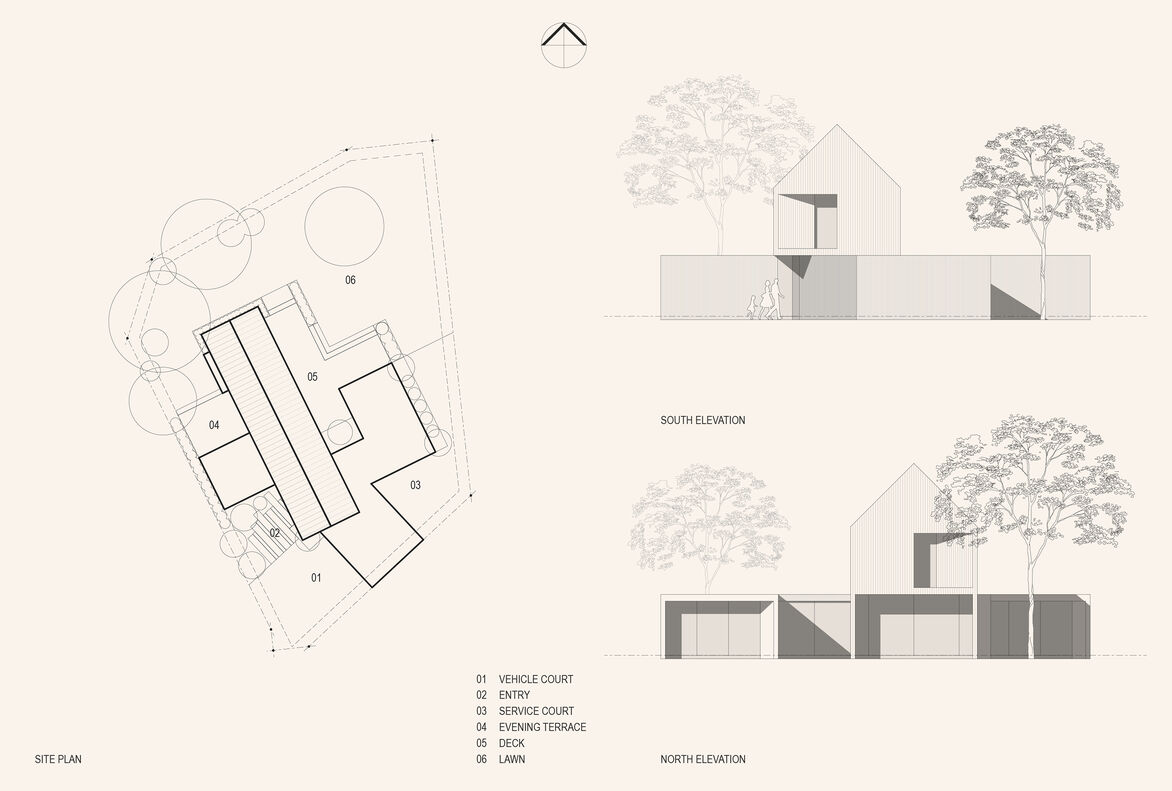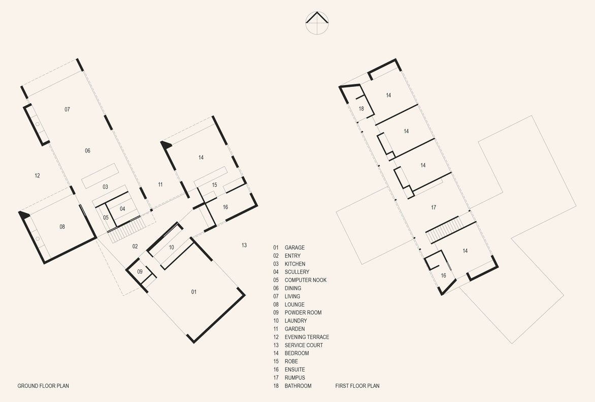The Fulcrum House explores and evolves a contemporary domestic archetype that has become familiar to the suburban streets of Christchurch; a model that commonly sees a single-storied garage, a double height entry atrium and a two-storied (often gabled) form containing the living and sleeping spaces arranged in a formal line up from shortest to tallest and pushed hard against the southern boundary of the property (in a "fight the boundary, chase the sun" type approach). In this instance, this 'familiar' plan is deconstructed and rearranged to suit the trapezoidal geometry of the site boundaries, utilising the central entry atrium as a fulcrum or pivot point, providing a common circulation point between public living, private sleeping and auxiliary service spaces.