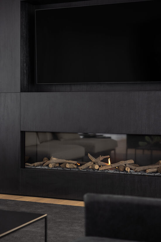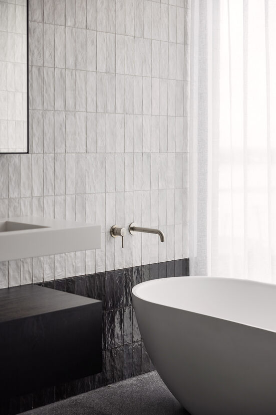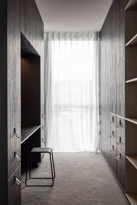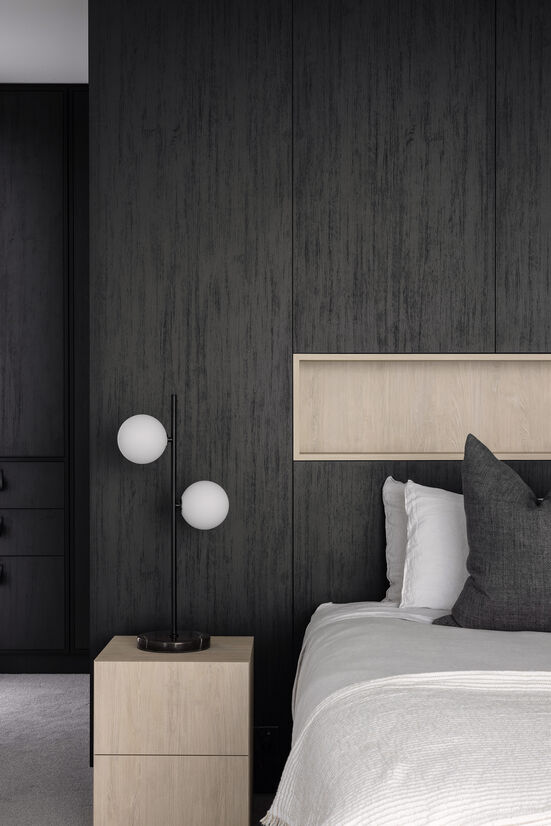 Upstairs, a freestanding bath sits in front of a full height picture window within the Primary Ensuite, capturing arguably the best vantage point of the view from within the house. Three thousand black and white hand made tiles dress the walls of this space. A 450mm high ‘tide line’ of black tiles conceal the black timber storage joinery below two wall mounted hand basins. Oak veneer through the Primary Robe is a continuous feature from the lower floor to maintain a consistent tonal palette throughout the house.