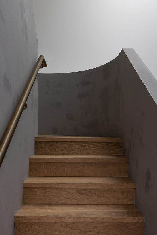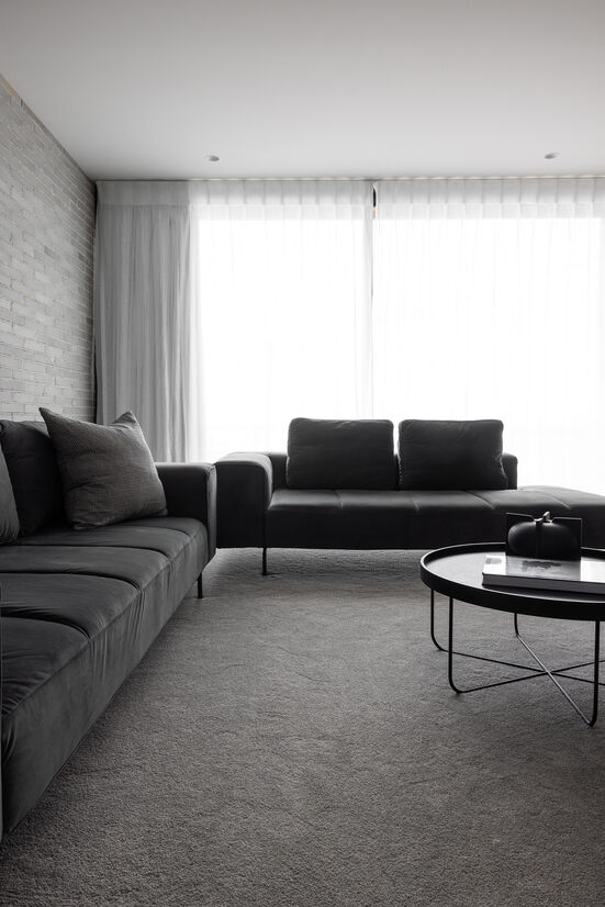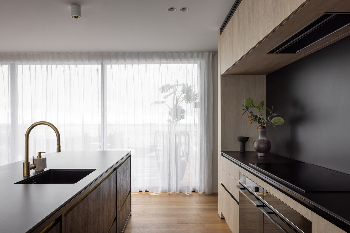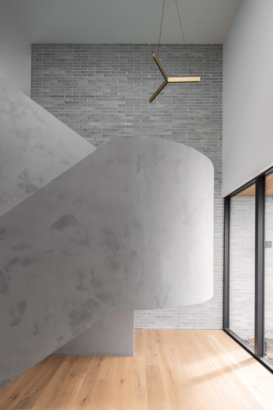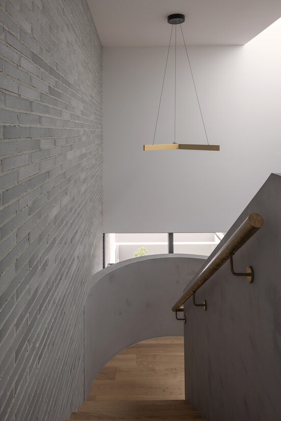 Upon arrival, a ‘Le Corbusier inspired’ staircase sits as a sculptural piece within the double-height entry atrium. Its Milano plaster finish compliments the locally manufactured custom clay bricks that clad the monolithic building form, turning internally to line either side of the entry. Internal material selections are visually soft, but hardy to withstand two energetic toddlers. Hue’s of Oak are prominent features on the floor and joinery elements. Dark toned joinery creates containment within more intimate spaces, complimented with bronze and/or leather handle details. Conversely, light timber joinery creates a sense of airiness to the open social spaces, modulated with strong horizontal lines of stark black.