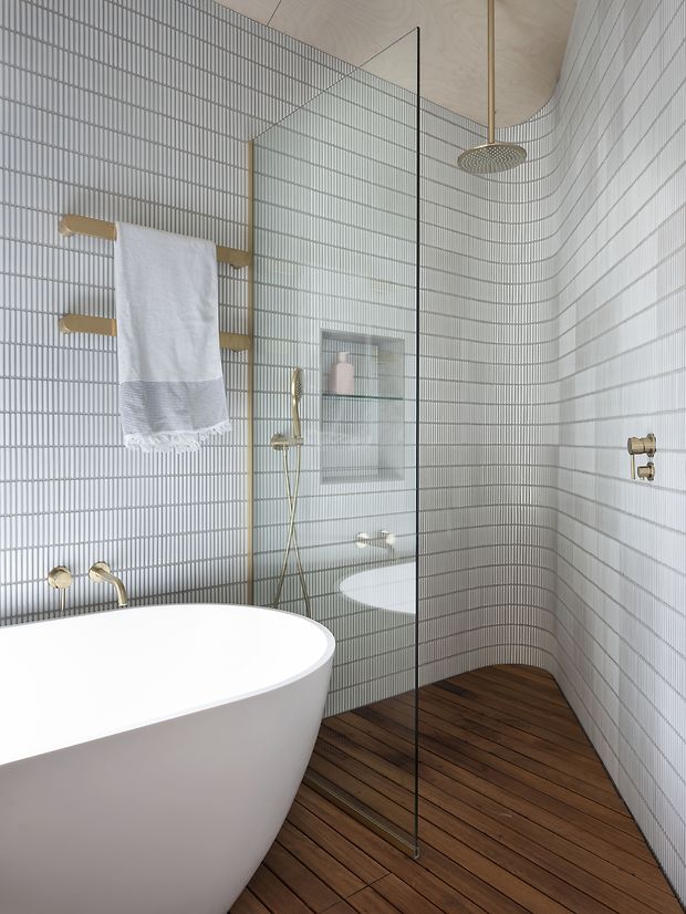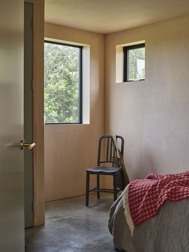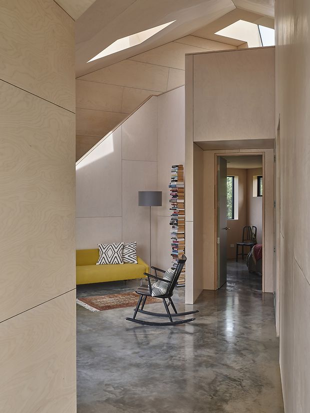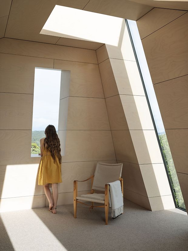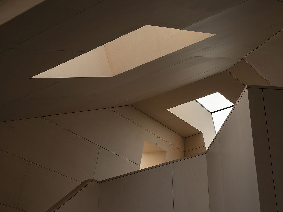 The interior geometry is somewhat complex, and the horizontal banding of plywood forms ‘contours’ around the room, which again talks to the idea of ‘stratification’. As the bands move up the walls, the scale changes, getting longer or wider in each row. A natural wood oil finish to the plywood distinguishes the ‘envelope’ with everything else inside the ‘envelope’ being finished with a natural wood oil with a slight white tint. It creates a subtle colour shift defining the exterior ‘envelope’ and the interior walls within it.