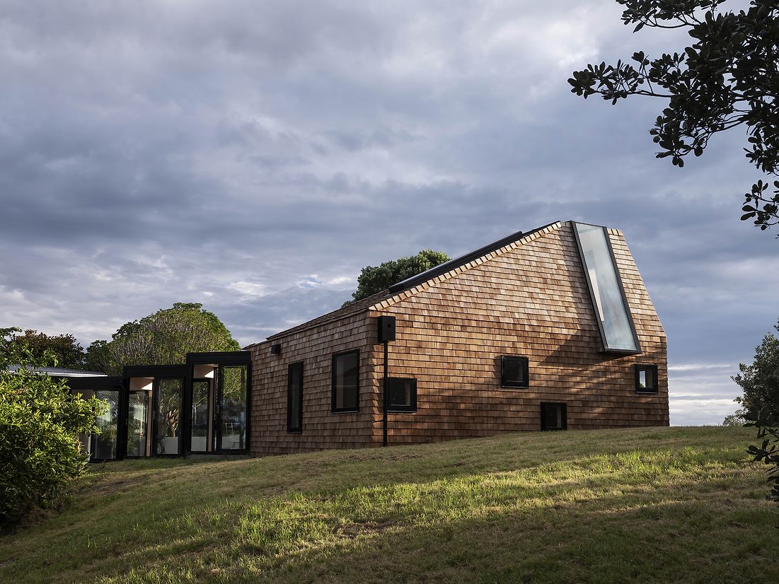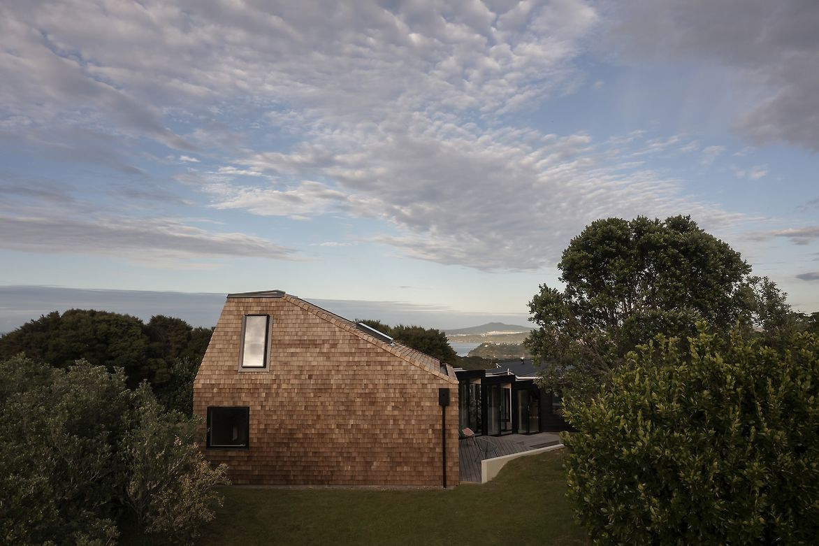 The geology seen at Ōmiha Bay is unique on Waiheke with significant mineral banding/stratification in the rock formation. This banding was a key driver in the both the exterior and interior material selection. The cedar shingles creating a sense of ‘banding’ traveling up the building in a series of contours – like the lines running through the Ōmiha Bay rocks.