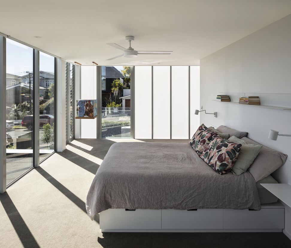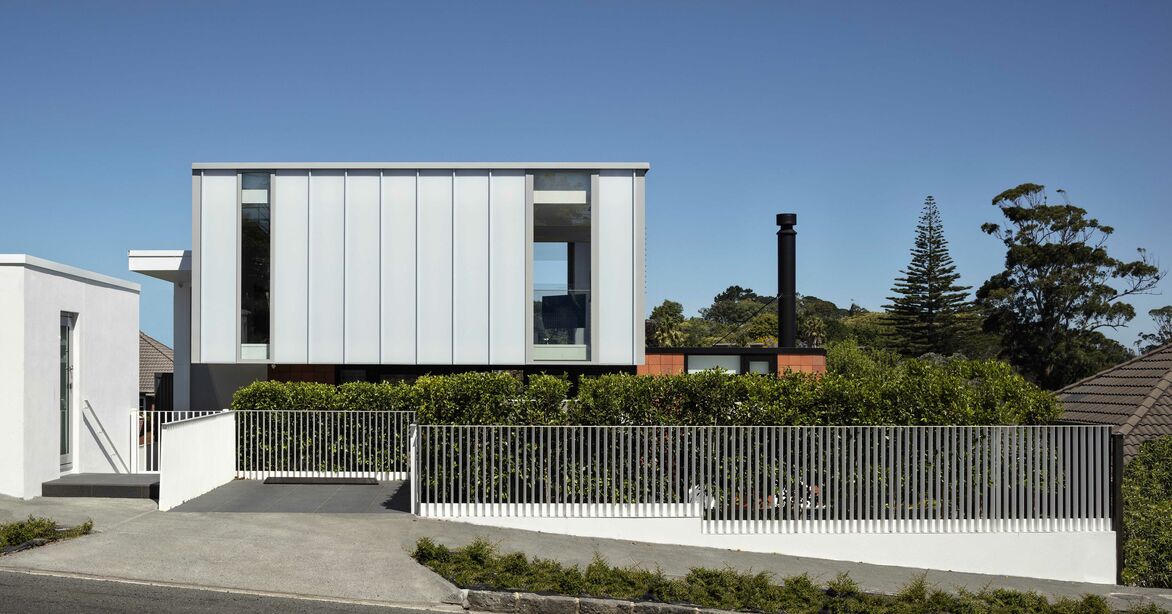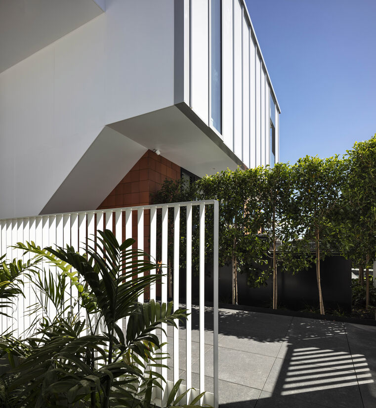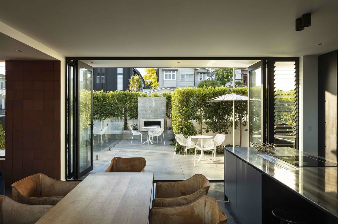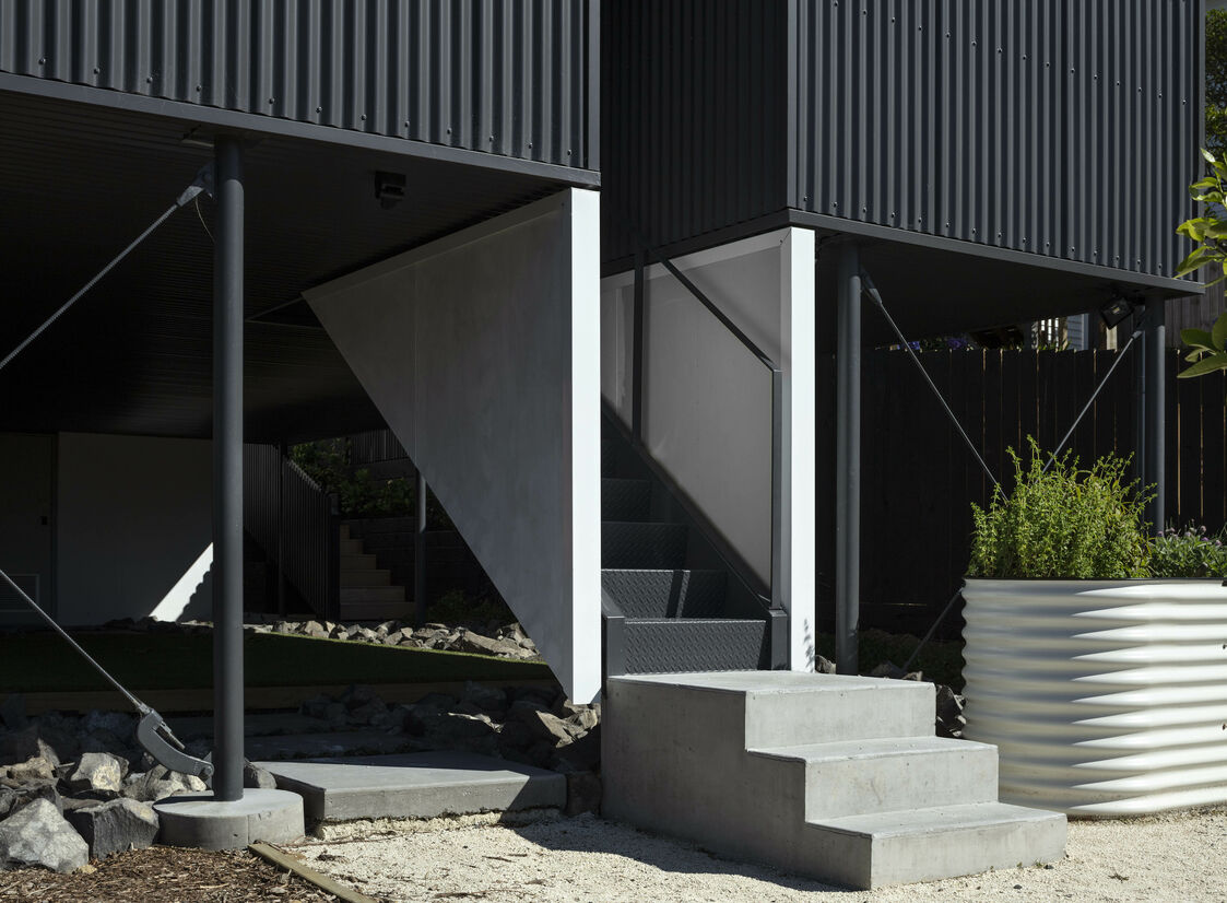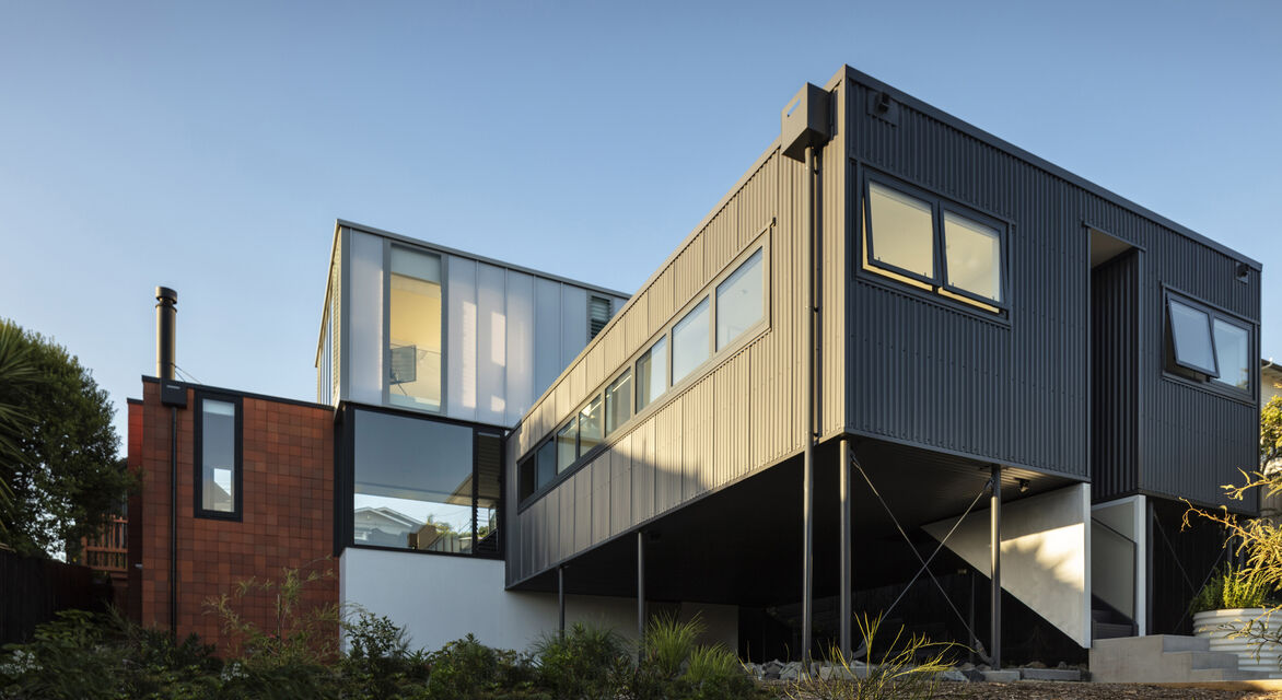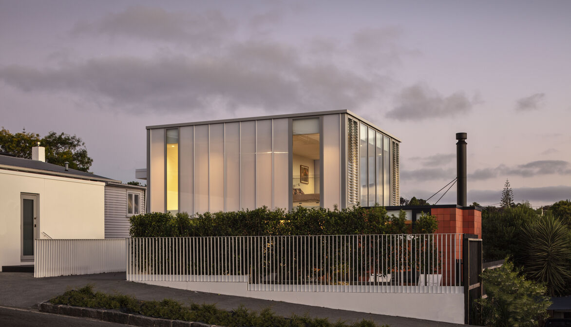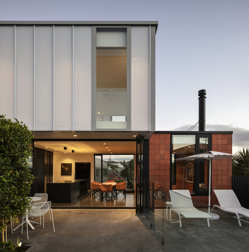 The home has four bedrooms, all of modest size. The architecture is a combination of cubic forms each clad in a unique material. The kitchen/dining area is largely glazed. The living area is clad in a terracotta tile, being ‘a memory’ of the existing brick building that was on the site. The rear bedroom-wing is clad in utilitarian, ubiquitous corrugated iron hovering above the ground on slender poles with a sculptural chute accessing the garden. And the main bedroom a translucent light box providing privacy, light and interest, and again being a nod to the existing colours within the street.