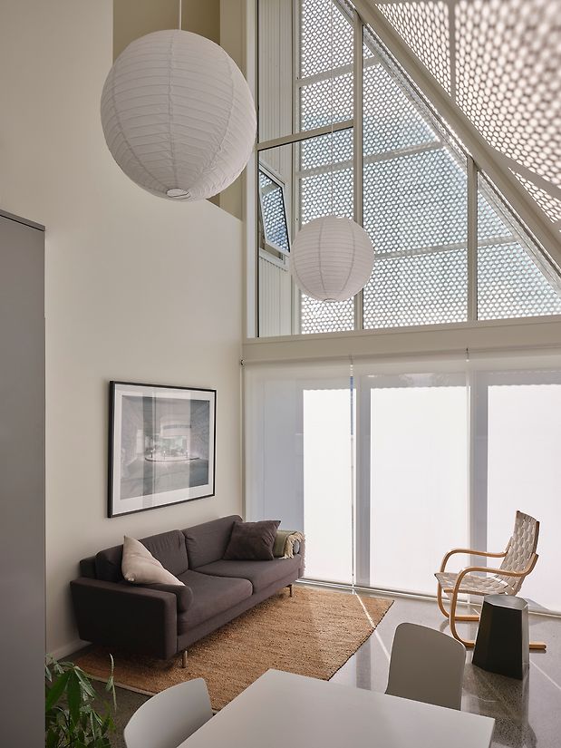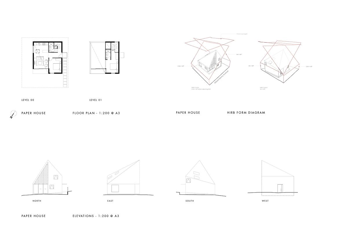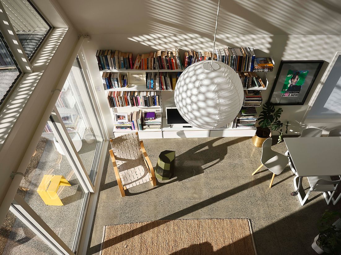 The resulting home has a double-height living space and stacked bedrooms and bathrooms. The living room ceiling is approximately 8.5 meters high, and its profile is asymmetrical, ascending at different angles to negotiate the HiRB recession plains. The main bedroom looks both north externally through traditional windows and internally over a balustrade into the main volume.