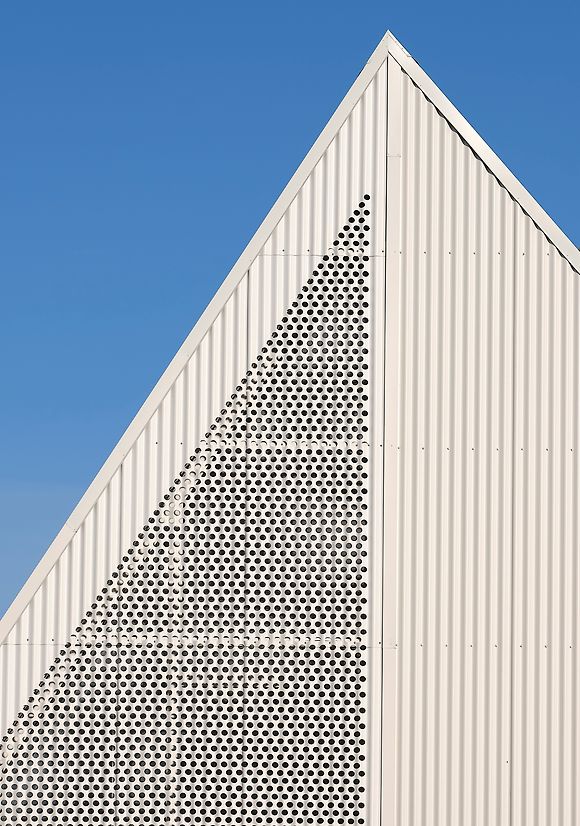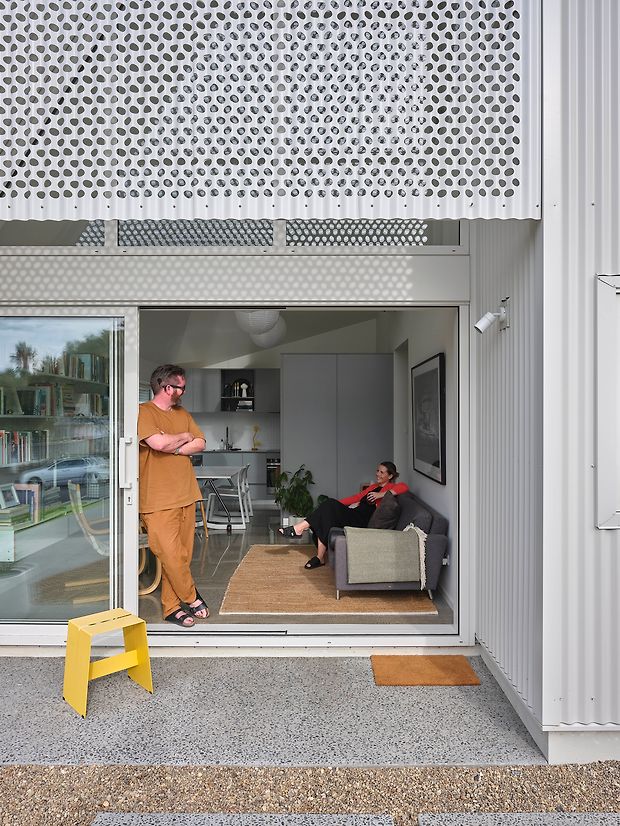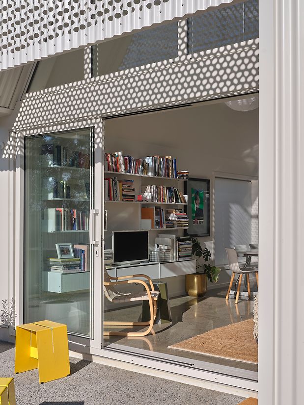 In the screening, the CNC router works in two dimensions and usually on a flat sheet. Here, because of the three-dimensional wave of the corrugate, each perforation sits at a unique angle and has a slightly different shape. Some are oval, some even look heart-shaped and so each shadow is subtly different. As the sun moves, the screen stops the living area from overheating, and projects patterned shadows into the space.