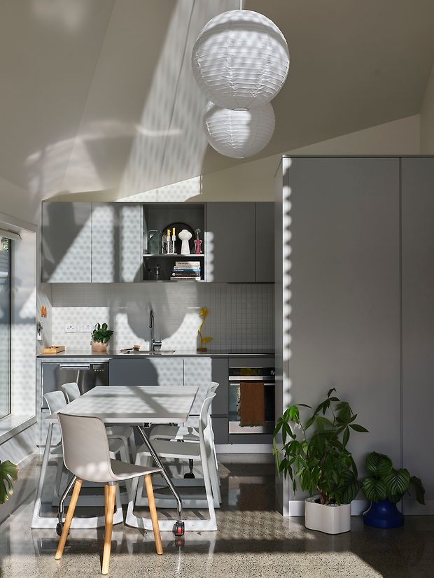In the early stages of the design, we recognised the need to provide a brise soleil screen for protection of the northern glazing and gesture to the main street elevation. We signaled to our clients that we had designed a ‘placeholder’ screen, and they should design the final screen. In collaboration us and Minka Ip at Finework, they designed and had fabricated a CNC-cut perforated corrugated aluminium screen.
