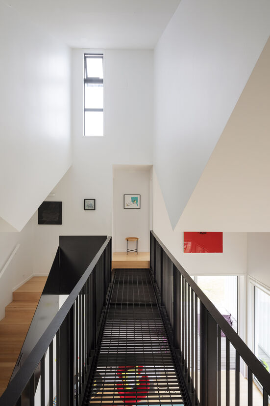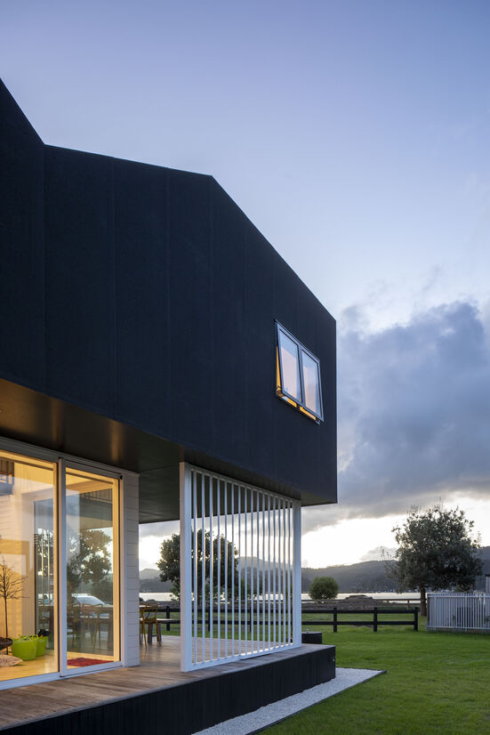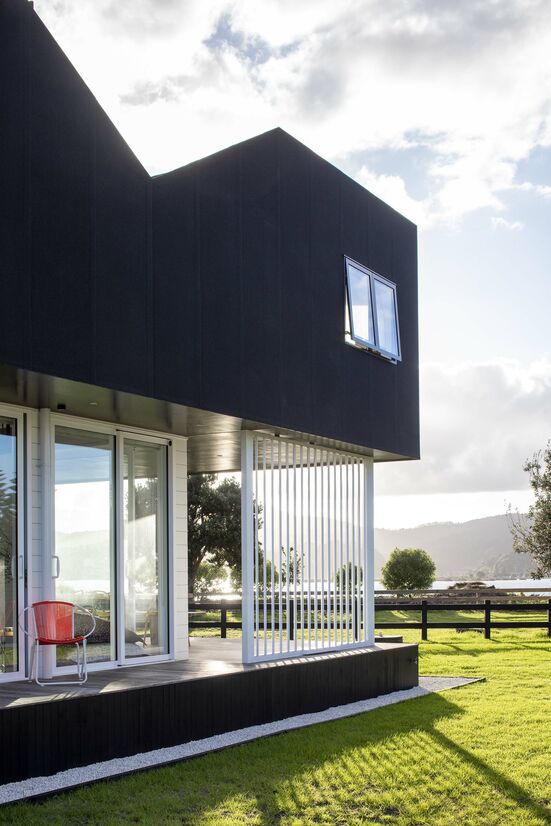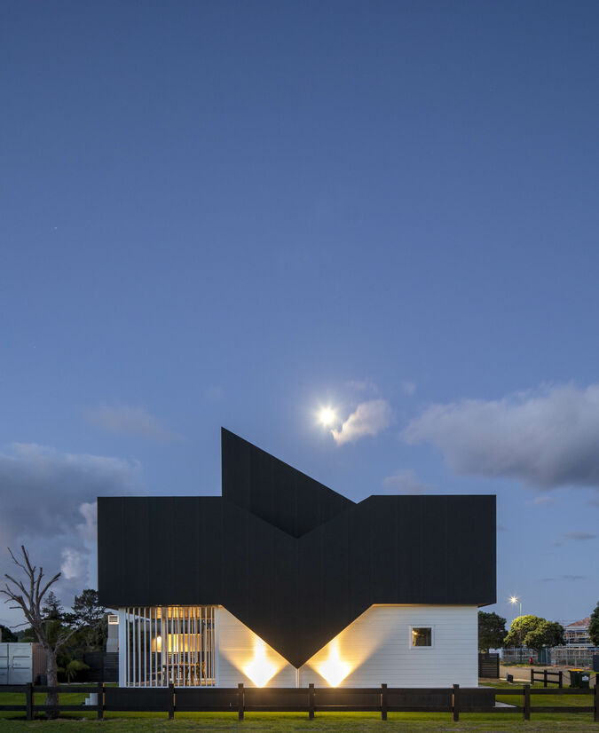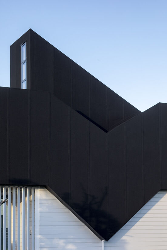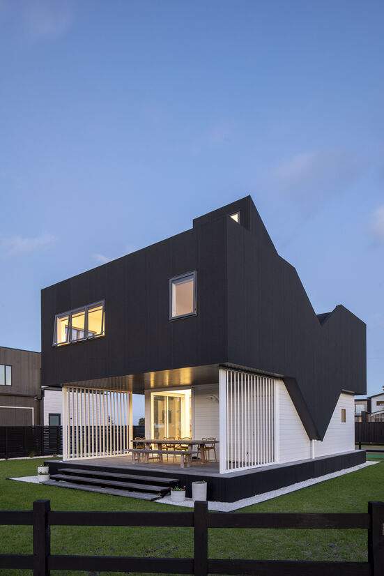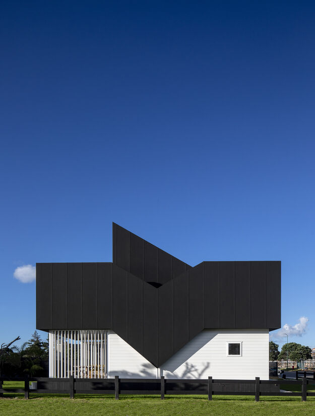 An escape from a city apartment, the client was looking for a looser, more open space to spread out in a home well connected to the sun. A collector of sculpture and paintings, a sculptural home was the intent, providing an interesting and dynamic getaway, largely for a couple, but with the ability to expand, catering for gatherings of the extended family. The house was to be made of materials appropriate to the marine environment, requiring minimal maintenance, with a simplicity and robustness. Situated at the Northern tip of the Omaha Peninsula this house sits boldly on a flat site within its semi-suburban context and looks out towards an estuary to the west. A habitable sculpture with a dynamic roof, a chevron delineating interior circulation, stairs, and a future roof terrace accessed with a high-level ‘pop out’ exit. Deliberately, there is no garaging- cars are ok in the elements! The interior spills out onto the lawn, with positioning to accommodate a ‘tent city’ on the section in Summer for family holidays. The material palette is pared back and robust. An artistic response expresses contrasting materiality and colour between base, middle and top. Membrane roofing, traditionally used in roofing applications, wraps down as a cladding for the top floor. The tarry black membrane sits in contrast to the smooth white weatherboards below in colour, tradition, and texture. The major moves of innovation are the materiality and the form. The use of roofing membrane as a dark and textured cladding floating atop a smooth traditional white weatherboard pacts a powerful punch upon arrival. The sculptural form reflecting the interior circulation creates dynamic ceiling volumes and an exciting sense of movement inside.