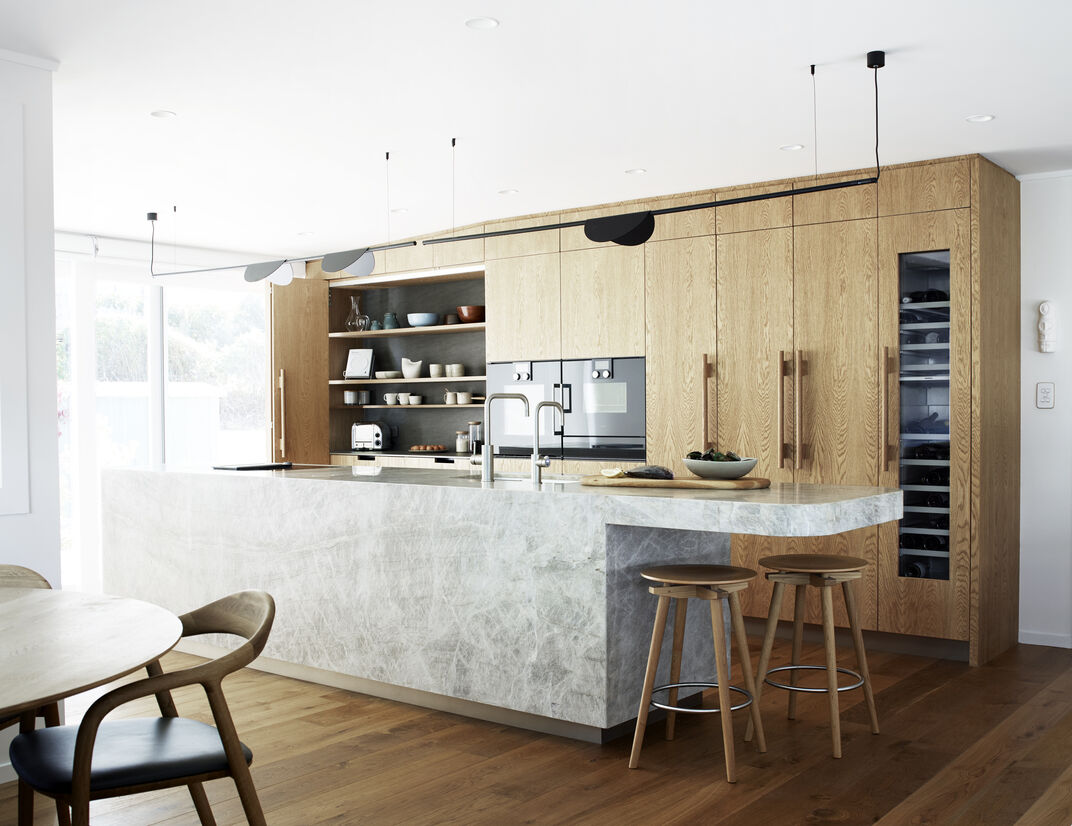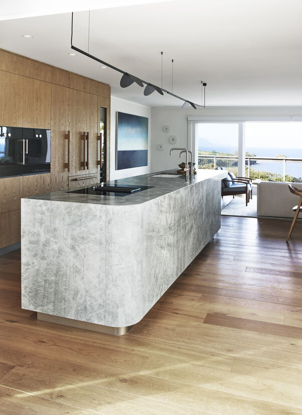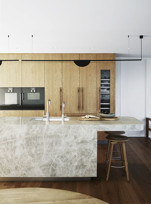 A monumental stone kitchen island combined with warm timber veneers. A rich, evocative material palate and a deeply thoughtful and inviting series of spaces.