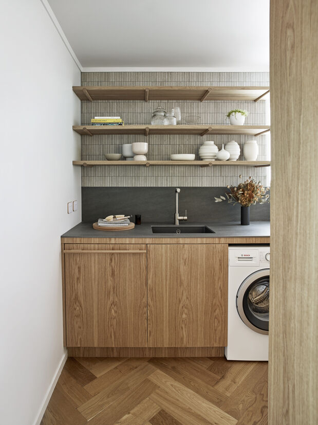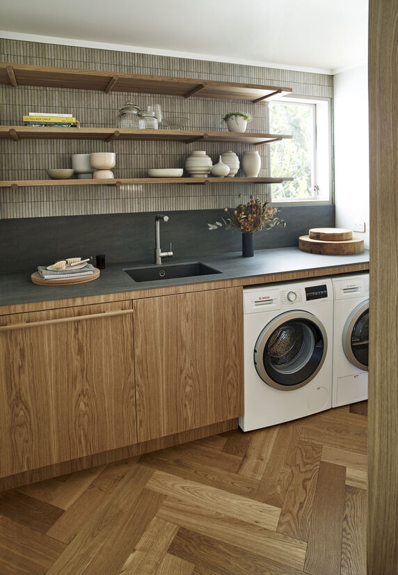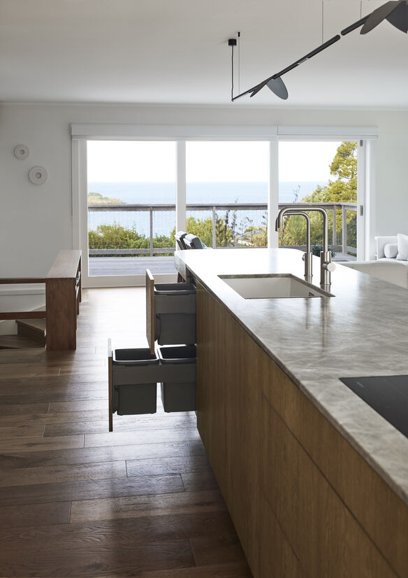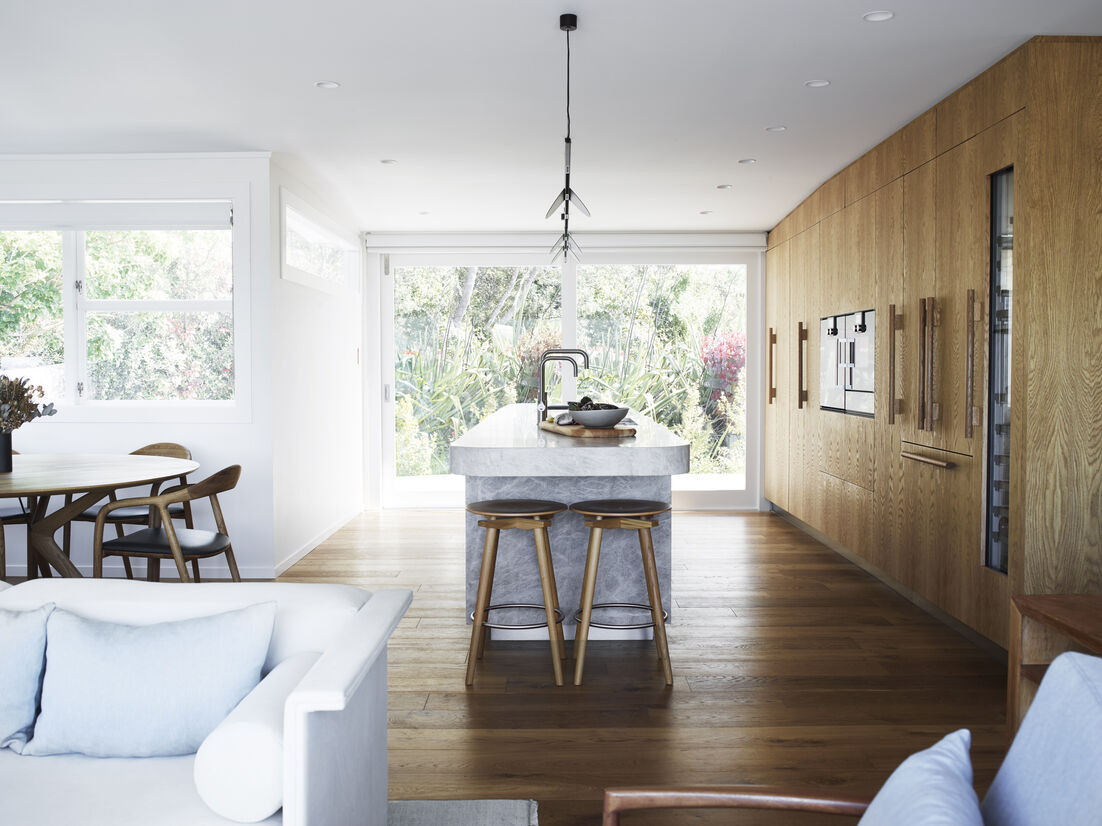 This home has beautiful, eastern sea views, which Natalie felt really needed to be celebrated, so she re-oriented the kitchen to ensure whoever was working in the space would still get to see these views. Her clients requested a large serving area on the seaward side of the kitchen island, which she cantilevered to provide comfortable seating for two. A round timber table close by which also encourages good interaction. Natalie recommended to open the tight, u-shaped kitchen layout into a galley island configuration, as this would encourage more flow and, with an addition of large glass doors at the rear, would also allow light to flood into the space from both the back and the front decks. The laundry room is now a multi-functional space which provides overflow pantry/crockery storage too, with a drink’s fridge - always useful with a house full of guests.
