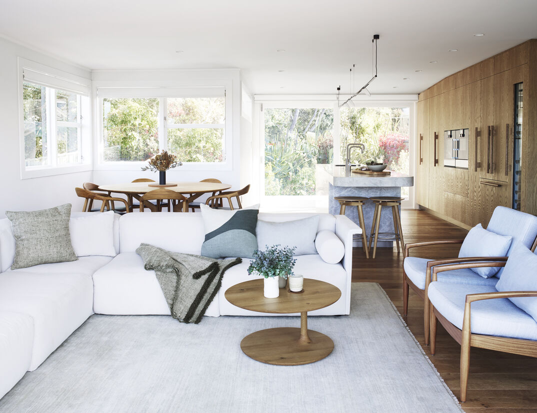 Furniture pieces like the round dining table, sculptural dining chairs and the L-shape sofa - covered in stain proof fabric - were all specified to work together. As the kitchen island is on show from all angles, Natalie included an additional working area with behind full height multi directional bifold doors - timber veneer shelving and drawers, with a Basalt Grey Neolith back and benchtop ensure it looks good left open or closed.