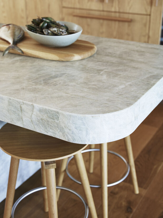 With a focus on timber throughout, the interior is lightened by the stone clad island and wall and ceilings painted in Resene half Rice Cake. The slim black strip lights above the island have random cap details with an almost bird-wing shape echoing the beachy feel of this coastal home. The result is an easy-to-work-in, holiday home interior that oozes the feeling of relaxation and good times.