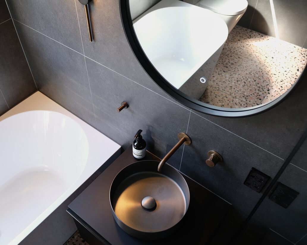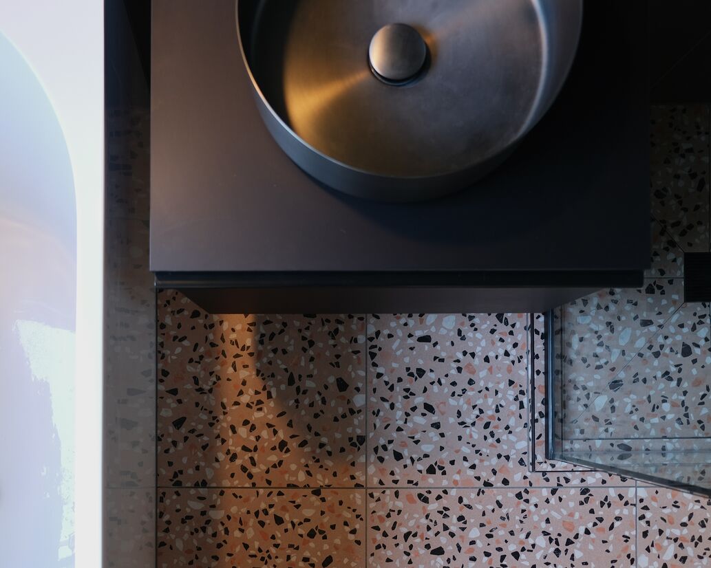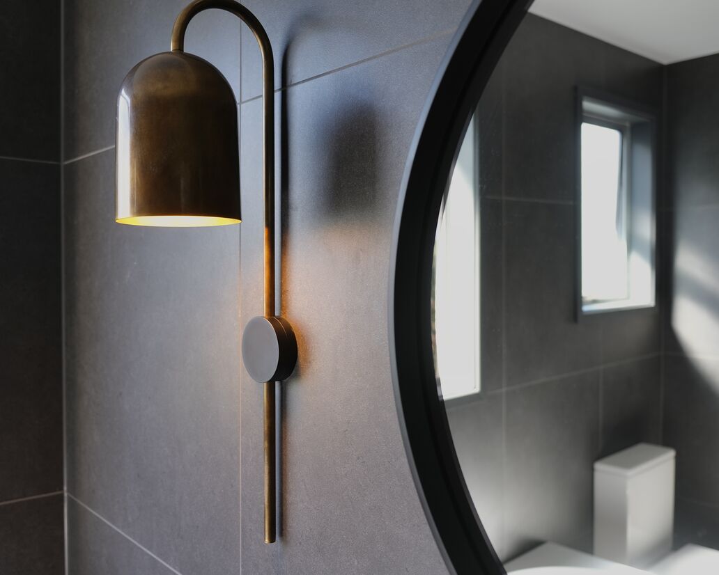 The bathroom walls are a subdued basalt tile. The floor offers relief to what is quite a moody space with pink terrazzo, and this pop is balanced by the aged brass tapware. Soft lighting in aged brass from Nightworks helps to create a calming space in the bathroom and the main bedroom, with walls painted in Midnight Moss from Resene.