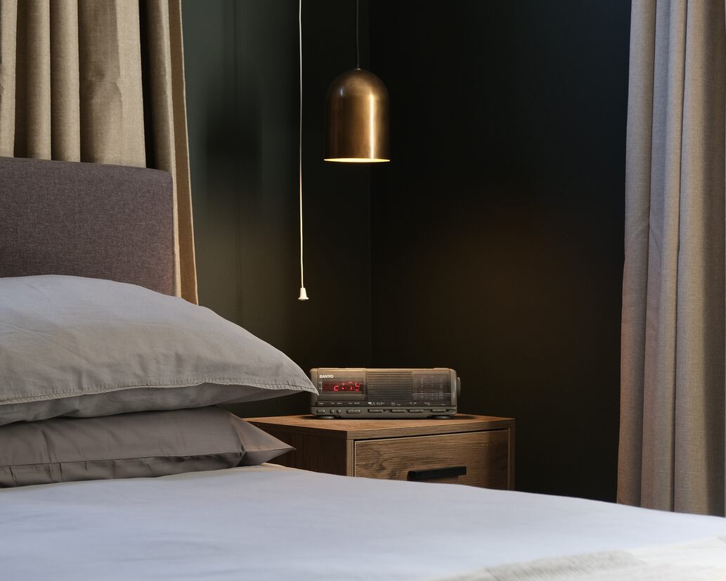 Laminate has been used for benchtops and timber veneer used in the kitchen, replicating the original materials used. The original knobs were also used along with new hardware as a nod to the house’s history while retaining the coherence with the existing door hardware upstairs. The original stair balustrade was somewhat hidden in the hallway; now exposed for better appreciation. Lighting was used to pull the interiors back a few decades with track lighting, and a Jo Hammerborg pendant over the dining area was salvaged from the client’s family home. Controlled lighting allows for all lights to be turned off while the pendant remains on, creating an intimate feel in an otherwise very open room. The bathroom walls are a subdued basalt tile. The floor offers relief to what is quite a moody space with pink terrazzo, and this pop is balanced by the aged brass tapware. Soft lighting in aged brass from Nightworks helps to create a calming space in the bathroom and the main bedroom, with walls painted in Midnight Moss from Resene. At time of purchase, it was half the price of newly built central townhouse, which are a similar size, but with no real outdoor space. The project was about providing an example to other first home buyers that there is great value in the older housing stock that can be retrofitted to meet today’s standards while getting the size of an older property. With climate change and the shadow of Covid affecting building supplies, we need to look at utilising all existing housing stock and retrofitting to meet today’s needs, rather than them ending up in landfill. Not only does this retain our existing character, but it helps to reduce our demand on the environment when building and improves the environmental impact of the building.”