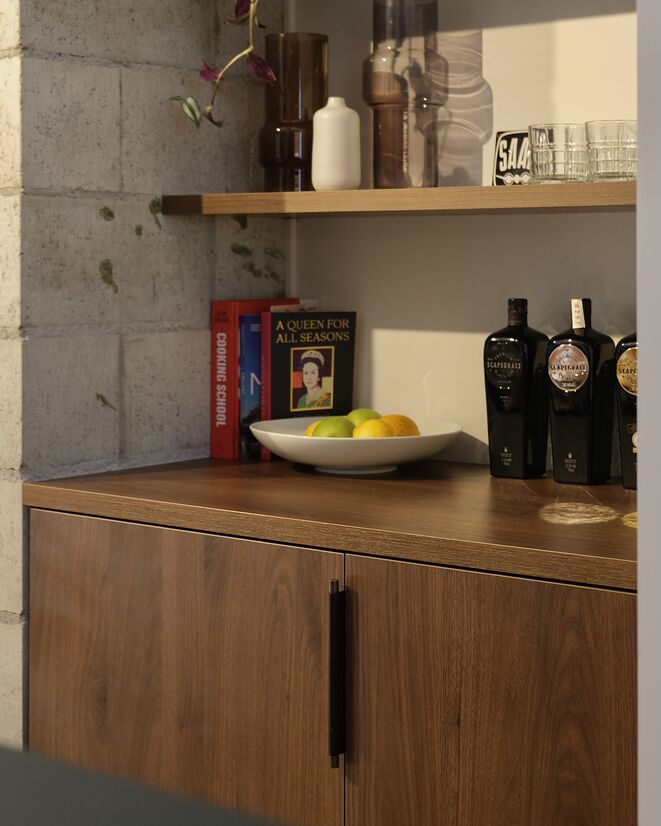 The original floor plan had a main living area connected to a separate kitchen via an archway and a laundry off the stair/hallway area. Upstairs has a bedroom at each end with a bathroom and separate toilet between them, like many 1970s townhouses around Christchurch.The ground floor was opened up to allow for a more flexible space, with a new door cut from one of the existing windows to allow access to a deck and better connect the house and garden. The cupboard under the stairs was removed to widen the living area and expose the existing concrete block pier. In its place, a built-in sideboard and shelving maximise storage.