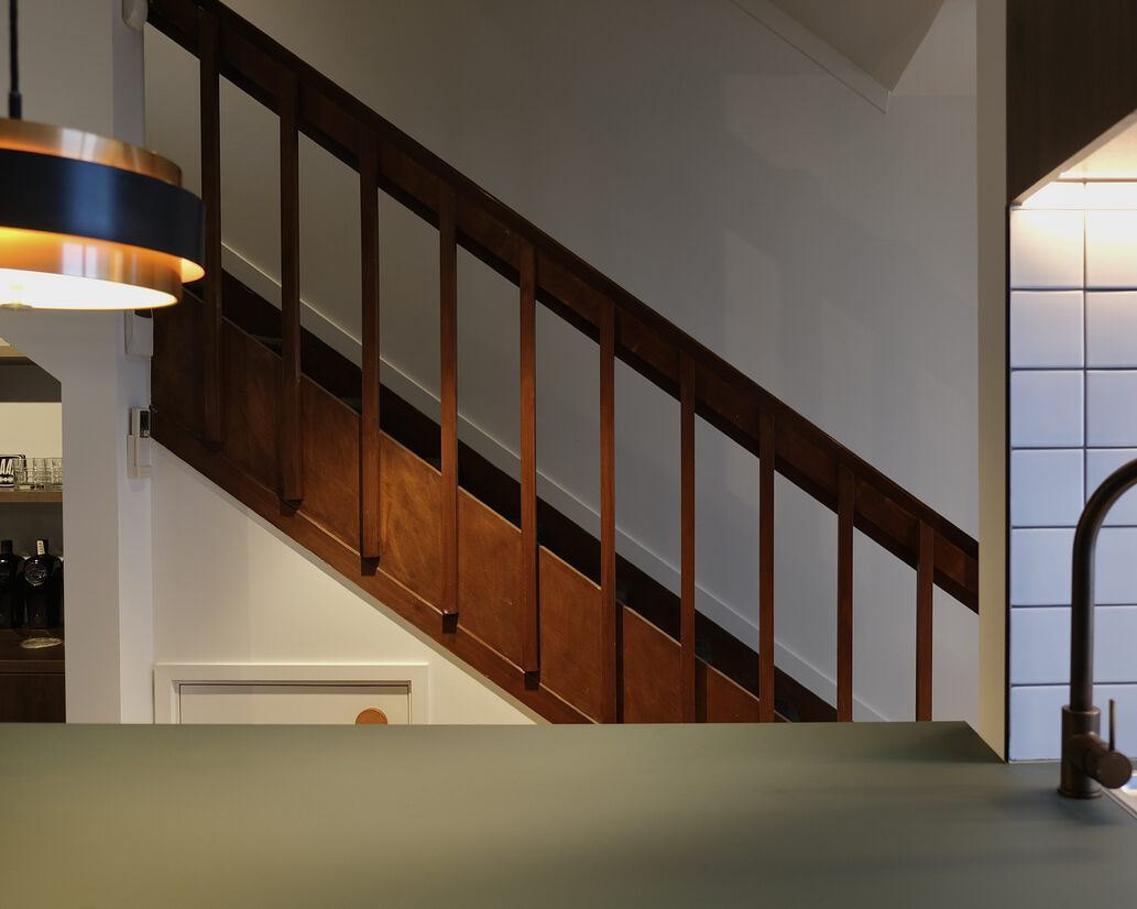 Laminate has been used for benchtops and timber veneer used in the kitchen, replicating the original materials used. The original knobs were also used along with new hardware as a nod to the house’s history while retaining the coherence with the existing door hardware upstairs. The original stair balustrade was somewhat hidden in the hallway; now exposed for better appreciation. Lighting was used to pull the interiors back a few decades with track lighting, and a Jo Hammerborg pendant over the dining area was salvaged from the client’s family home. Controlled lighting allows for all lights to be turned off while the pendant remains on, creating an intimate feel in an otherwise very open room.