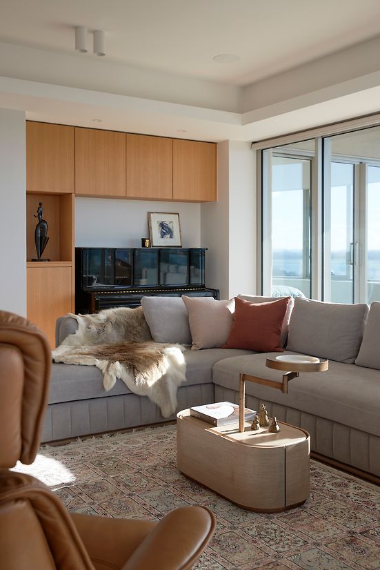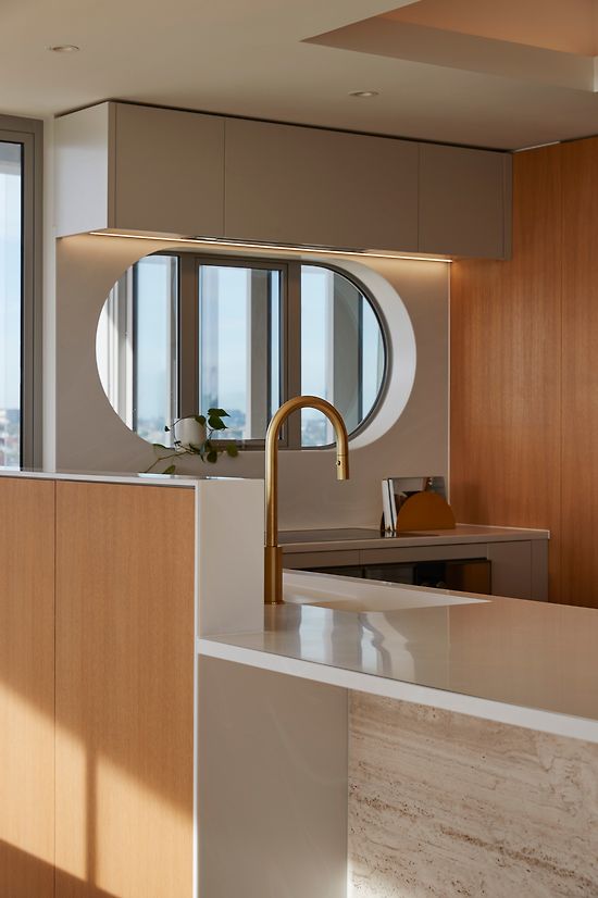 A large, dated 80’s apartment was stripped and made over, with a complete re-plan and refurbishment. City and sea views were reallocated to living and bedroom spaces respectively; the buzz of the city for socialising; the calm of the sea for retreating. A sense of entry was created with a defined, elegant and welcoming lobby space. Views and sunlight were analysed and brought into the apartment with better planning and spatial design for every room, to avoid the previously closed-in and slightly claustrophobic feeling the apartment had. Plenty of storage was added throughout and clear spatial boundaries were set up between all the bedrooms, allowing multi generations to have their own sense of space and privacy. Materials were kept to a reduced and consistent pallet throughout, carefully selected to enhance a sense of refuge and quiet warmth. Main finishes were stained oak veneer, travertine tiles, Corian and natural stone tops, and brass fixtures and detailing. Subtle brass highlights and blush pink fittings add a sense of charm and surprise. Ceilings were pushed up into inter-floor structural space to optimise height and space, and delineate living areas. Cabinetry was carefully designed throughout the apartment to allow for plenty of storage, divide open plan spaces and add warmth to the interior. Fine details added luxury and refinement, from handle-less cabinetry to brass inlaid flooring trims. The project was highly successful in fulfilling the clients' aspirations for the apartment; the views to the harbour and city, the lightness of the spaces, and the warmth of the materials and finishes, celebrate the apartment's location and elevation above the city, and make every day living simply more inspiring.