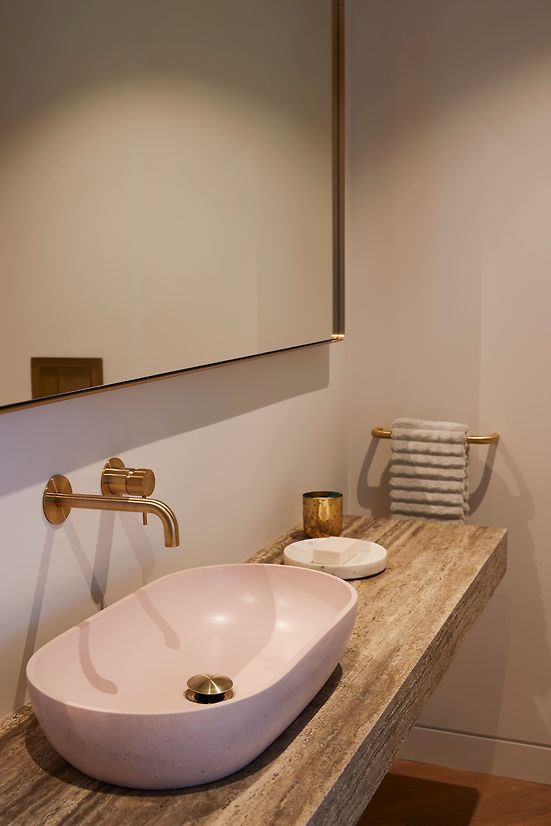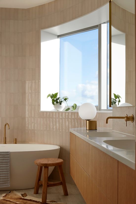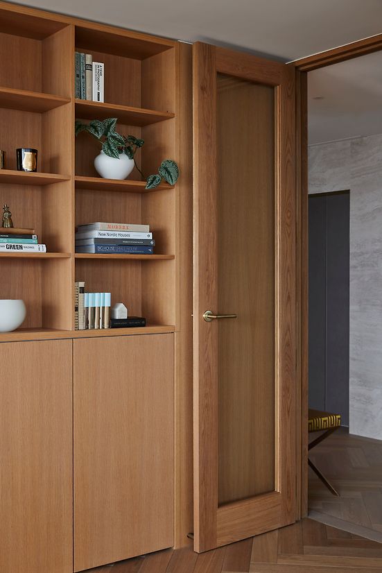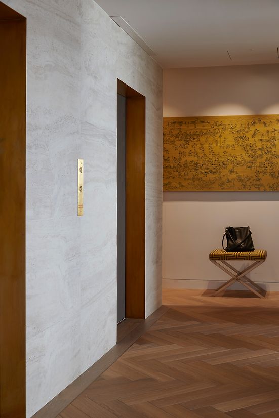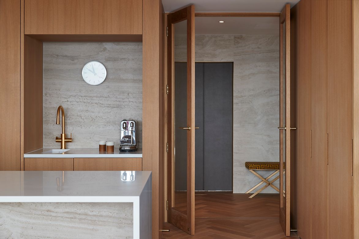 Materials were kept to a reduced and consistent pallet throughout, carefully selected to enhance a sense of refuge and quiet warmth. Main finishes were stained oak veneer, travertine tiles, Corian and natural stone tops, and brass fixtures and detailing. Subtle brass highlights and blush pink fittings add a sense of charm and surprise. Ceilings were pushed up into inter-floor structural space to optimise height and space, and delineate living areas. Cabinetry was carefully designed throughout the apartment to allow for plenty of storage, divide open plan spaces and add warmth to the interior. Fine details added luxury and refinement, from handle-less cabinetry to brass inlaid flooring trims.