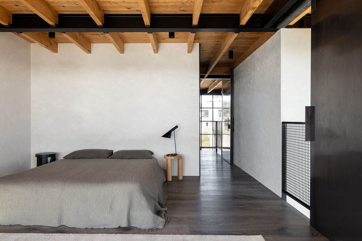 The more intimate scale of the master bedroom and ensuite, brings you closer to the textures of the house; the ceiling timber within reach, the brick alongside as you bathe and large raw steel sliding doors allow flexibility of privacy or connection between bedroom, ensuite and overlooking the main living area. Softly textured plaster provides a calm backdrop to the bed to offset the energy of the adjacent materials.