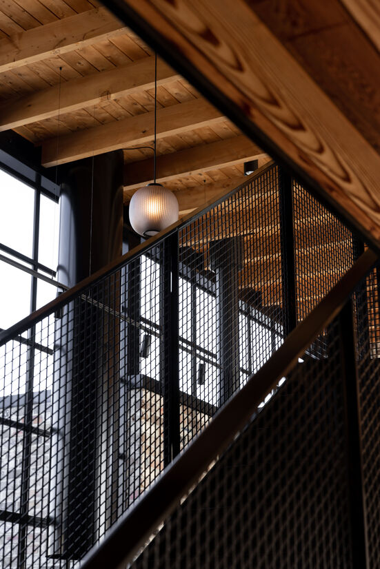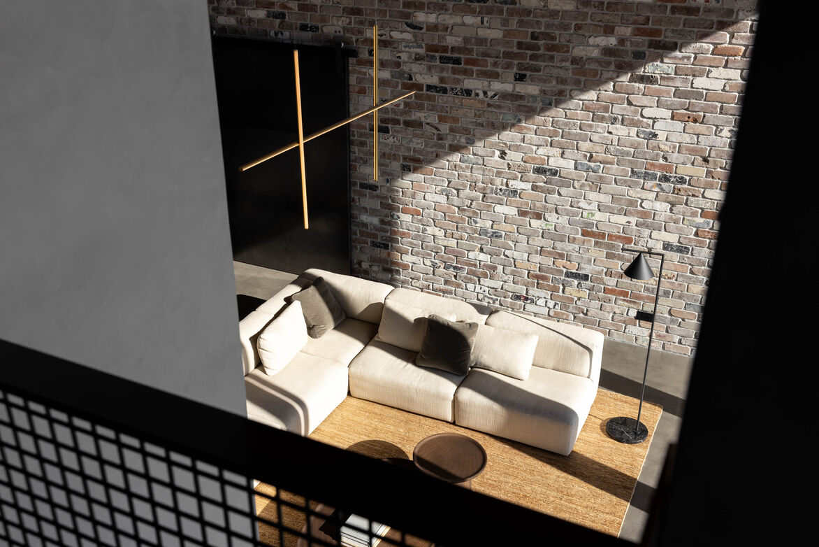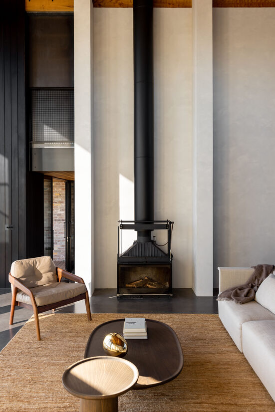 The oversized raw and rusted entrance door throws one immediately into a double height space, the confluence of the building's horizontal and vertical circulation. Exposed black steel stairs ascend to a mezzanine master bedroom. Height restrictions on the site meant that the secondary lounge space below this mezzanine had to be sunken below the main floor level, which created an opportunity for a more intimate experience in the snug below.