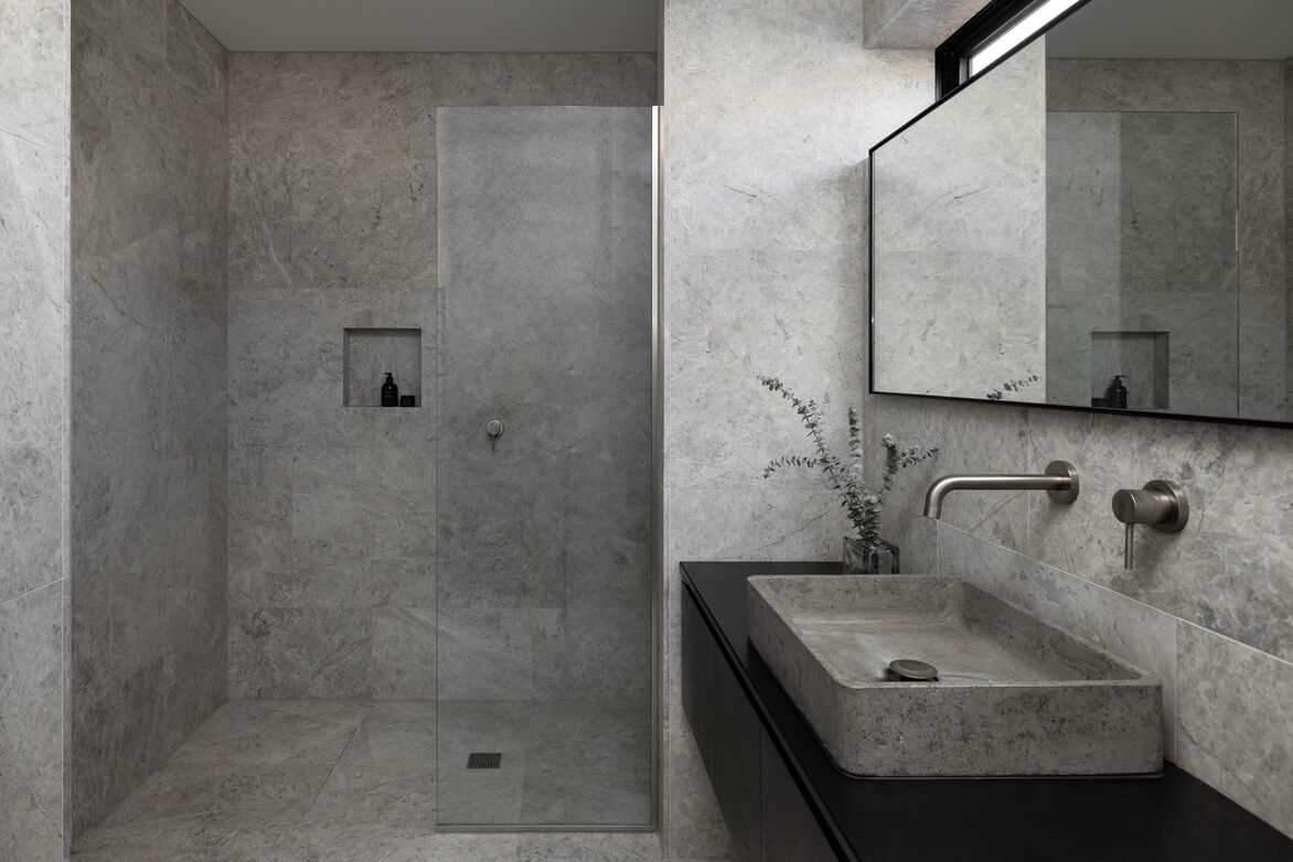 The secondary bedrooms, bathrooms and service areas flank the main building to the east and west and provide a quieter experience. The bathroom is completely wrapped in natural stone and soft light as a foil to the dramatic living spaces.