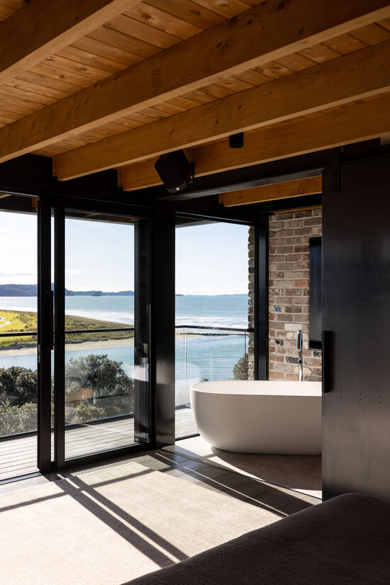 This house aims to unify the client's love for urban industrial spaces with their desire for living and engaging day-to-day with the sea. The client desired a fearless response to this site. One that challenged expectations of of what an Auckland coastal house should be. Designed as a series of moments that offer striking, contrasting and evocative experiences, to reject one's expectations of a residential property in this setting. The oversized raw and rusted entrance door throws one immediately into a double height space, the confluence of the building's horizontal and vertical circulation. Exposed black steel stairs ascend to a mezzanine master bedroom. Height restrictions on the site meant that the secondary lounge space below this mezzanine had to be sunken below the main floor level, which created an opportunity for a more intimate experience in the snug below. The kitchen and dining are combined in the lofty main 'warehouse' space to create an open and informal encounter. The back bench with massive gridded widows, exposed flues and a clay pizza oven. The kitchen island is the heart of the space; a natural stone jewel anchoring the surrounding area. The main living space celebrates industrial finishes and lofty height. With the exposed recycled brick wrapping inside, an exposed cast iron fire and flue held by plastered block walls, massive steel framed hinged doors opening you out to the view, all offset with the warmth of exposed macrocarpa ceiling joists and sarking. The more intimate scale of the master bedroom and ensuite, brings you closer to the textures of the house; the ceiling timber within reach, the brick alongside as you bathe and large raw steel sliding doors allow flexibility of privacy or connection between bedroom, ensuite and overlooking the main living area. Softly textured plaster provides a calm backdrop to the bed to offset the energy of the adjacent materials. The secondary bedrooms, bathrooms and service areas flank the main building to the east and west and provide a quieter experience. The bathroom is completely wrapped in natural stone and soft light as a foil to the dramatic living spaces. The interior architecture of this house was critical to its success and was designed closely and concurrently with the exterior architecture to provide an urban industrial experience alongside moments of calmer domesticity. This house pursues a desire for everyday enjoyment, novelty and refusal of convention.