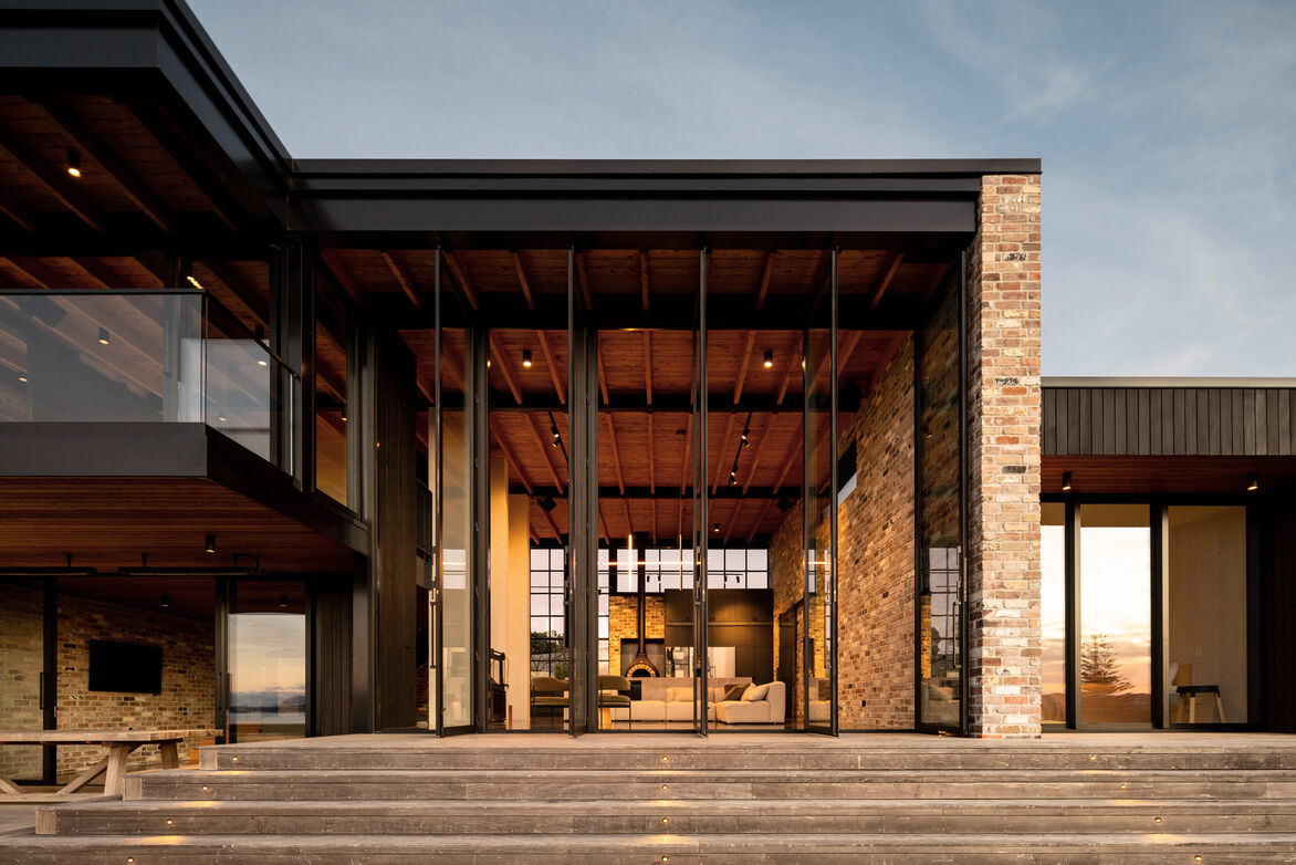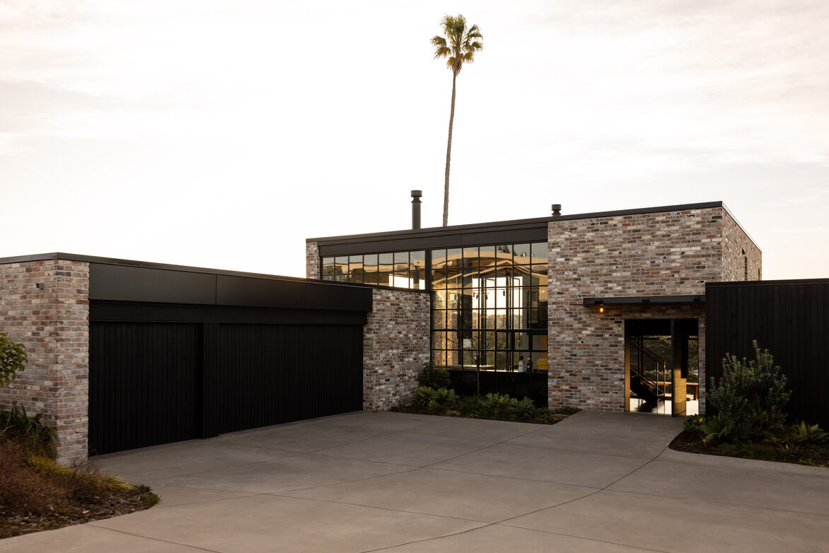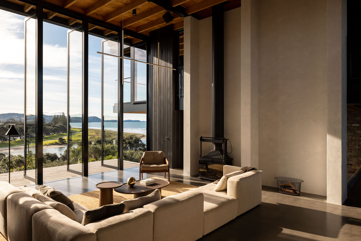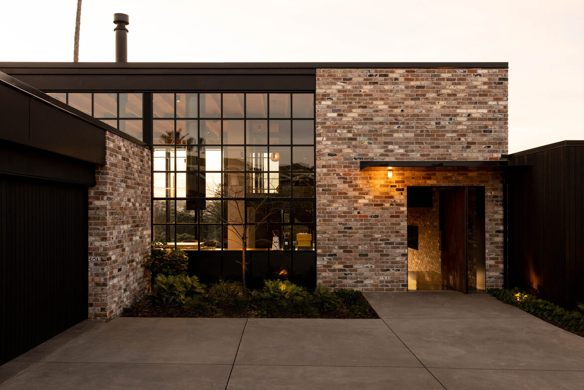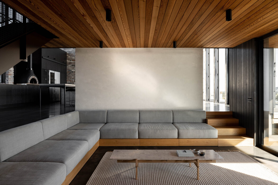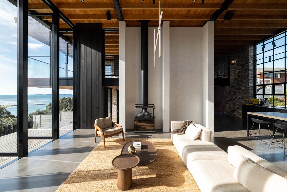 This house aims to unify the client's love for urban industrial spaces with their desire for living and engaging day-to-day with the sea. The client desired a fearless response to this site. One that challenged expectations of of what an Auckland coastal house should be. Designed as a series of moments that offer striking, contrasting and evocative experiences, to reject one's expectations of a residential property in this setting. The oversized raw and rusted entrance door throws one immediately into a double height space, the confluence of the building's horizontal and vertical circulation. Exposed black steel stairs ascend to a mezzanine master bedroom. Height restrictions on the site meant that the secondary lounge space below this mezzanine had to be sunken below the main floor level, which created an opportunity for a more intimate experience in the snug below. The kitchen and dining are combined in the lofty main 'warehouse' space to create an open and informal encounter. The back bench with massive gridded widows, exposed flues and a clay pizza oven. The kitchen island is the heart of the space; a natural stone jewel anchoring the surrounding area. The main living space celebrates industrial finishes and lofty height. With the exposed recycled brick wrapping inside, an exposed cast iron fire and flue held by plastered block walls, massive steel framed hinged doors opening you out to the view, all offset with the warmth of exposed macrocarpa ceiling joists and sarking. The more intimate scale of the master bedroom and ensuite, brings you closer to the textures of the house; the ceiling timber within reach, the brick alongside as you bathe and large raw steel sliding doors allow flexibility of privacy or connection between bedroom, ensuite and overlooking the main living area. Softly textured plaster provides a calm backdrop to the bed to offset the energy of the adjacent materials. The secondary bedrooms, bathrooms and service areas flank the main building to the east and west and provide a quieter experience. The bathroom is completely wrapped in natural stone and soft light as a foil to the dramatic living spaces. The interior architecture of this house was critical to its success and was designed closely and concurrently with the exterior architecture to provide an urban industrial experience alongside moments of calmer domesticity. This house pursues a desire for everyday enjoyment, novelty and refusal of convention.