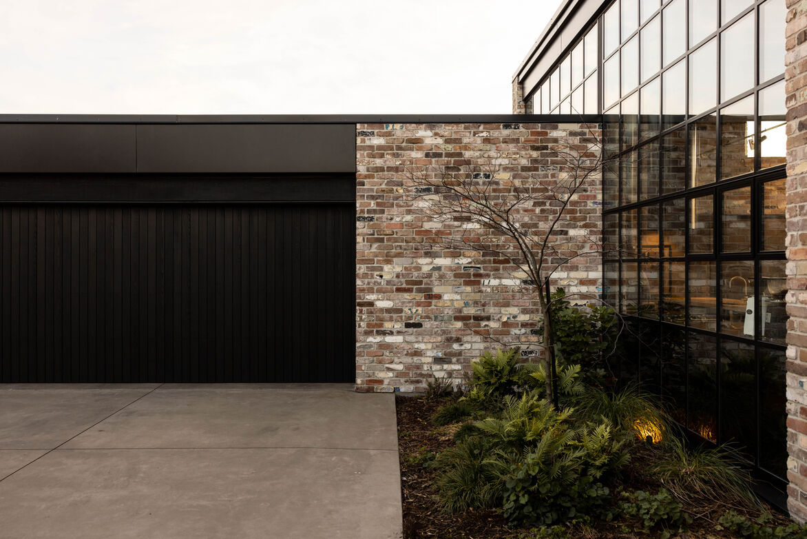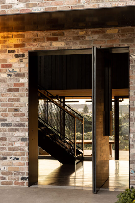 The oversized raw and rusted entrance door throws one immediately into a double height space, the confluence of the building's horizontal and vertical circulation. Exposed black steel stairs ascend to a mezzanine master bedroom. Height restrictions on the site meant that the secondary lounge space below this mezzanine had to be sunken below the main floor level, which created an opportunity for a more intimate experience in the snug below.