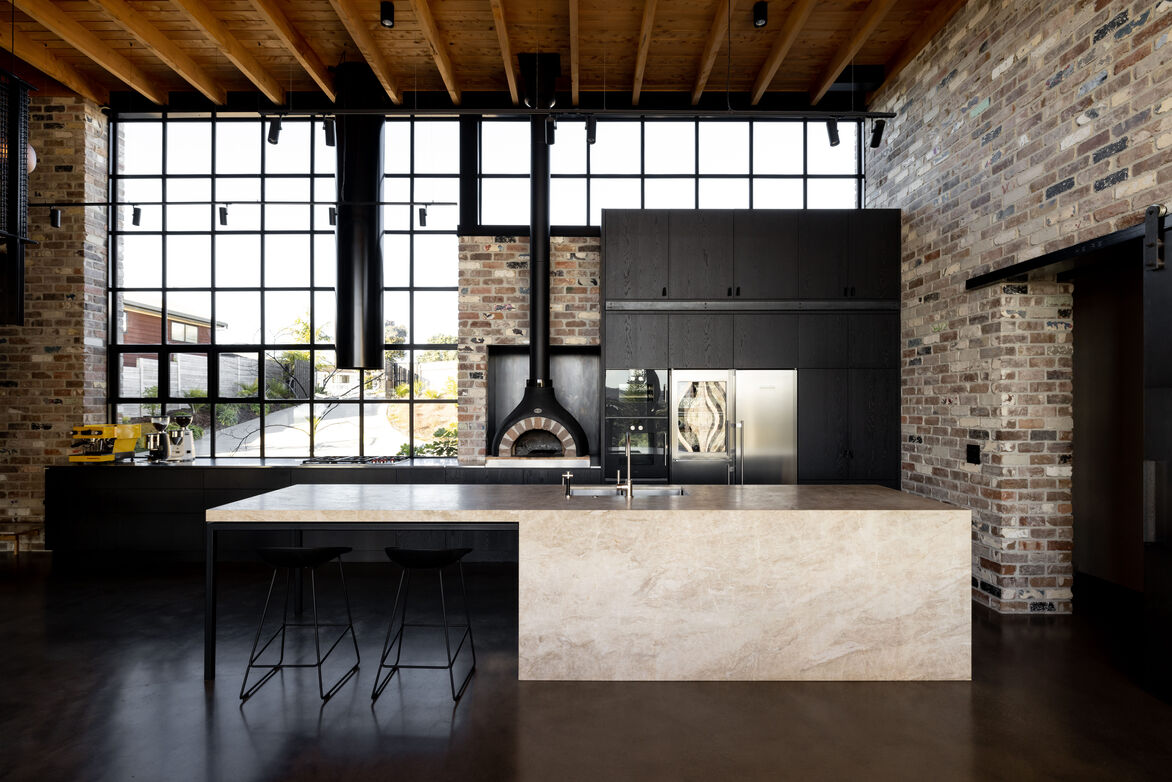 The kitchen and dining are combined in the lofty main 'warehouse' space to create an open and informal encounter. The back bench with massive gridded widows, exposed flues and a clay pizza oven. The kitchen island is the heart of the space; a natural stone jewel anchoring the surrounding area.